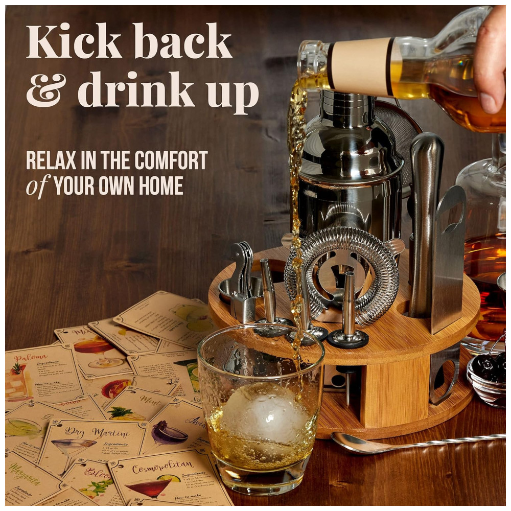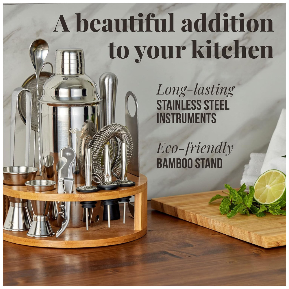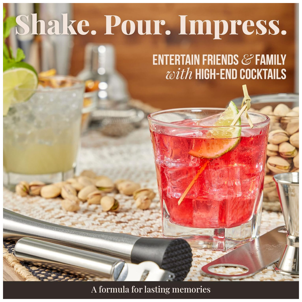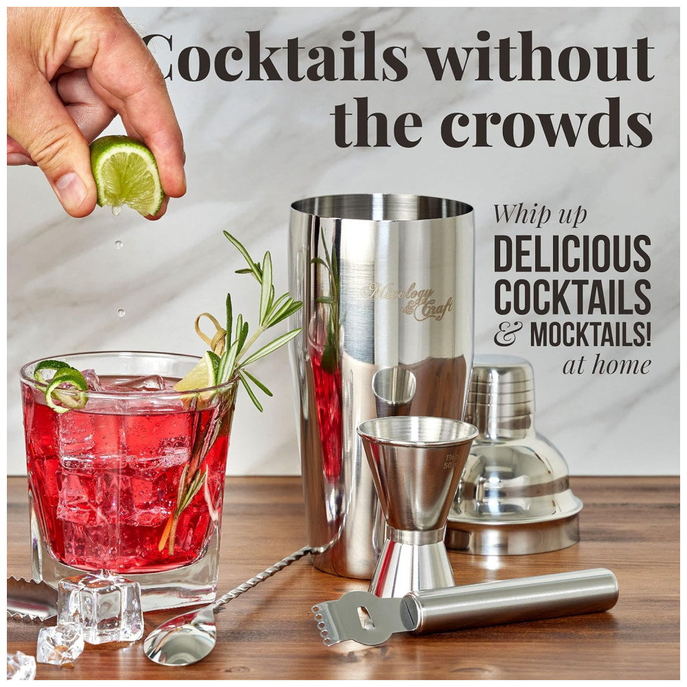 Mixology Cocktail Shaker Set covers all the basic tools to whip up cocktails for home or professional bartending. Its a value addition, and youll be drink mixing as easy as 1 2 3 The 15 Piece bar set includes 24 oz martini shaker with a built in strainer, mojito muddler, and much more. No behind the bar experience is required Calling all mixologists The shaker cocktail kit can easily handle one of the bartenders pet peeves spills. The lid has a smooth release design to pull apart with ease post mixing. Made of stainless steel, the cocktail set comes with high durability and aesthetic appeal. Rest assured, the cocktail kit doesnt easily get scratched or bent and will last longer. The cocktail bar set is dishwasher safe you can just toss this in, and it will come out squeaky clean. Also, get recipe cards to try Margaritas and Mojitos in no time