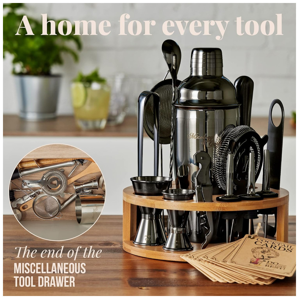 The Mixology Craft 15 Piece Bar Sets comes in a variety of colors, allowing you to choose the perfect tool and stand look to match your style. Weve got everything you need, minus the booze Our stainless steel instruments and bamboo stand are built to last. Use them time and time again to create your own perfect cocktails and mocktails. Conjure up new creations or stick to the favorites with the included recipe card. Whether youre new to mixed drinks or a master mixologist, this is a must have set for making premium cocktails at home. Mixology 15 Pc Bar Set Bar Set 16 Piece Mixology Bartender Kit Cocktail Shaker Boston Shaker Set Mixology Bartender Kit 10 piece Mixology Bartender Kit 23 piece Great for Making cocktails at home, decluttering kitchen with bamboo stand Serving cocktails from anywhere with included ice bucket This 4 piece set makes for easy cocktails at home, includes compact storage case Making cocktails at home, decluttering kitchen with bamboo or mahogany stand Rustproof Stainless Steel Tools Yes Multiple Tool Color Options No Includes Stand Includes Cocktail Recipe Cards, Book
