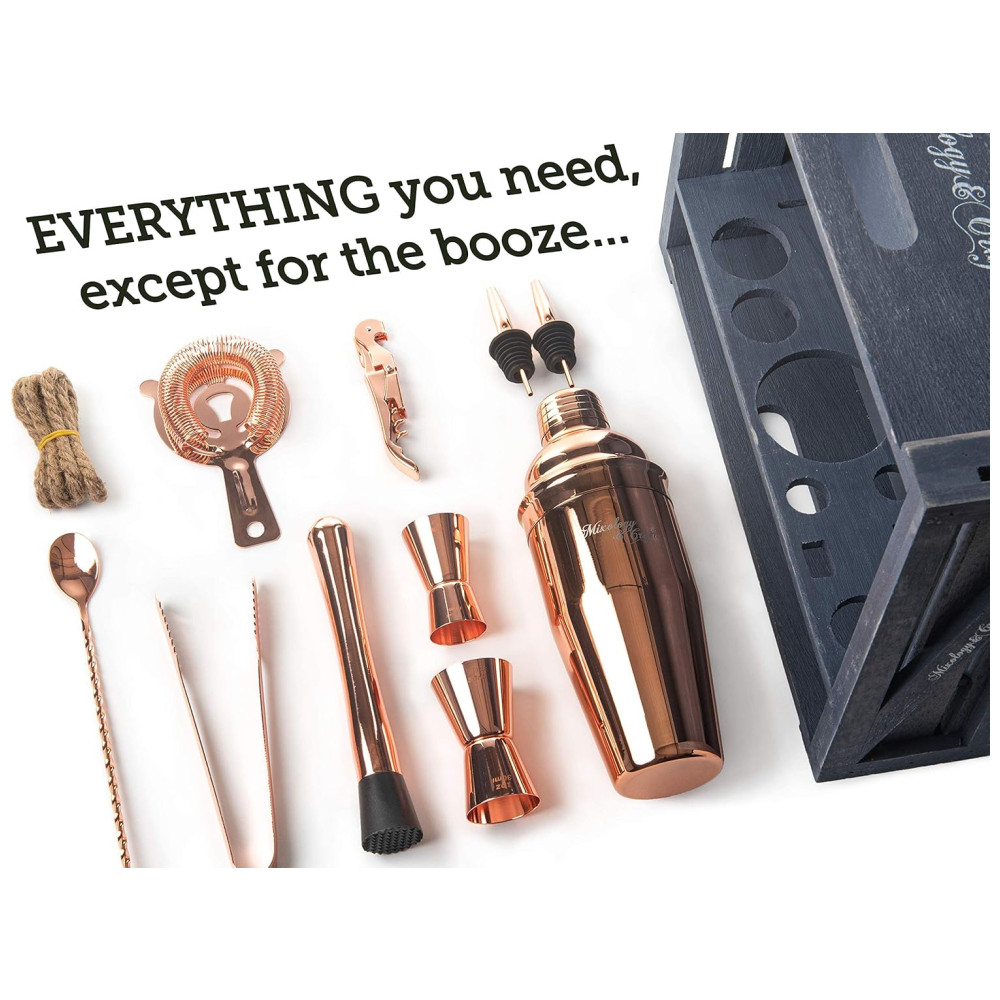 TUDO O QUE VOCÊ PRECISA EXCETO PARA O BOOZE Conjunto de bn de cobre TUDO INCLUÍDO de 11 peças de ferramentas de barra da prateleira superior. Dar lhe á o poder de preparar cocktails impressionantes para os seus convidados. Quer você seja um bartender amador ou um guru profissional da mistura de coquetéis, quer esteja abrindo um bar em casa ou no trabalho nosso conjunto de coquetéis de cobre é uma maneira brilhante de começar a trabalhar.