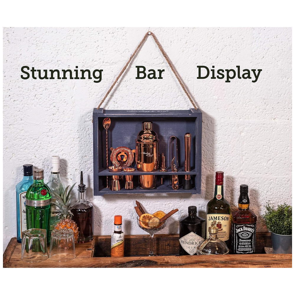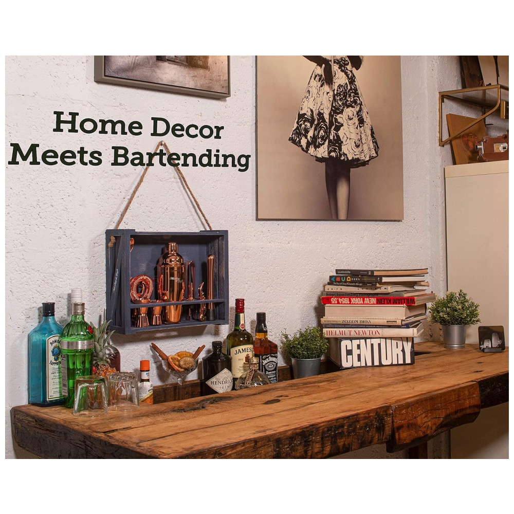 MANEIRA MAIS LEGAL DE ZENAR E EXIBIR SUAS FERRAMENTAS DE BAR Caixa de madeira de estilo rústico feita à mão, cuidadosamente projetada para manter suas ferramentas de bar organizadas e acessíveis em todos os momentos Chega de bagunça nas gavetas e armários da cozinha. Mostre o seu lindo kit de coquetel com a exclusiva prateleira de madeira para zenamento. Você definitivamente vai ganhar a atenção do seu convidado.