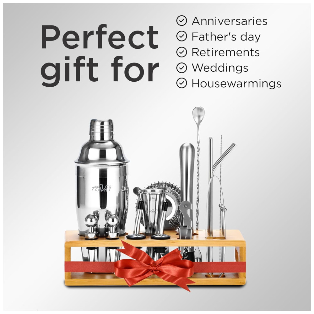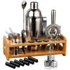 CONJUNTO EXCLUSIVO DE EQUIPAMENTOS DE BAR Os conjuntos de bar cocktail oferecem uma solução perfeita para todas as suas necessidades de utensílios de bar. Possui 25 peças, incluindo uma coqueteleira, permitindo que você atenda os clientes como um profissional. Além disso, o conjunto vem com um suporte de bambu para fácil organização e zenamento dos utensílios da barra. Ele vem com um menu de receitas exclusivo gratuito para fazer coquetéis incríveis.