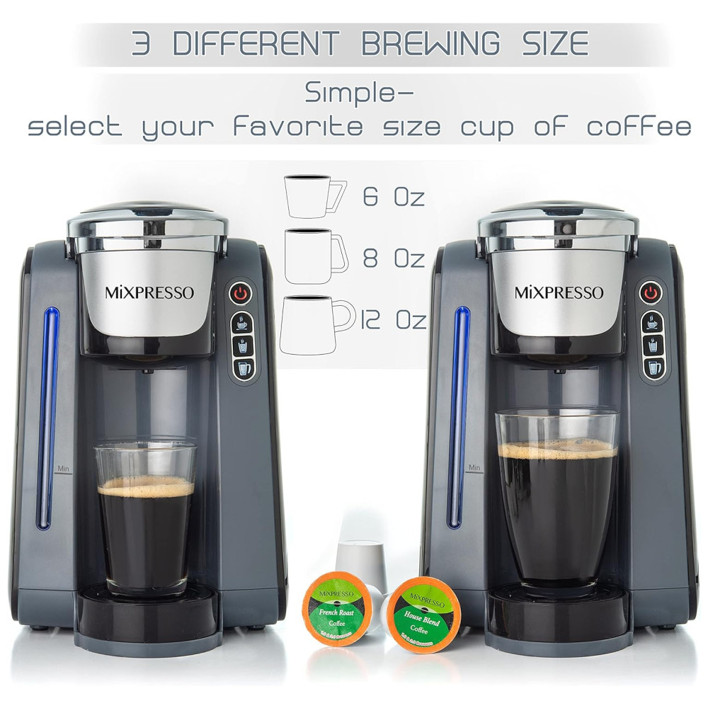 FORMATO DE CAFÉ K CUPS POD BREWS COFFEE A maioria dos formatos de vagem K Cup populares são manipulados por esta máquina de café. Eles também são compatíveis com as xícaras de dose única do Mixpresso. Você pode usar os k cups de 1.3 Litros para obter a cerveja mais forte. É fácil de transportar, o que o torna conveniente para qualquer ocasião.