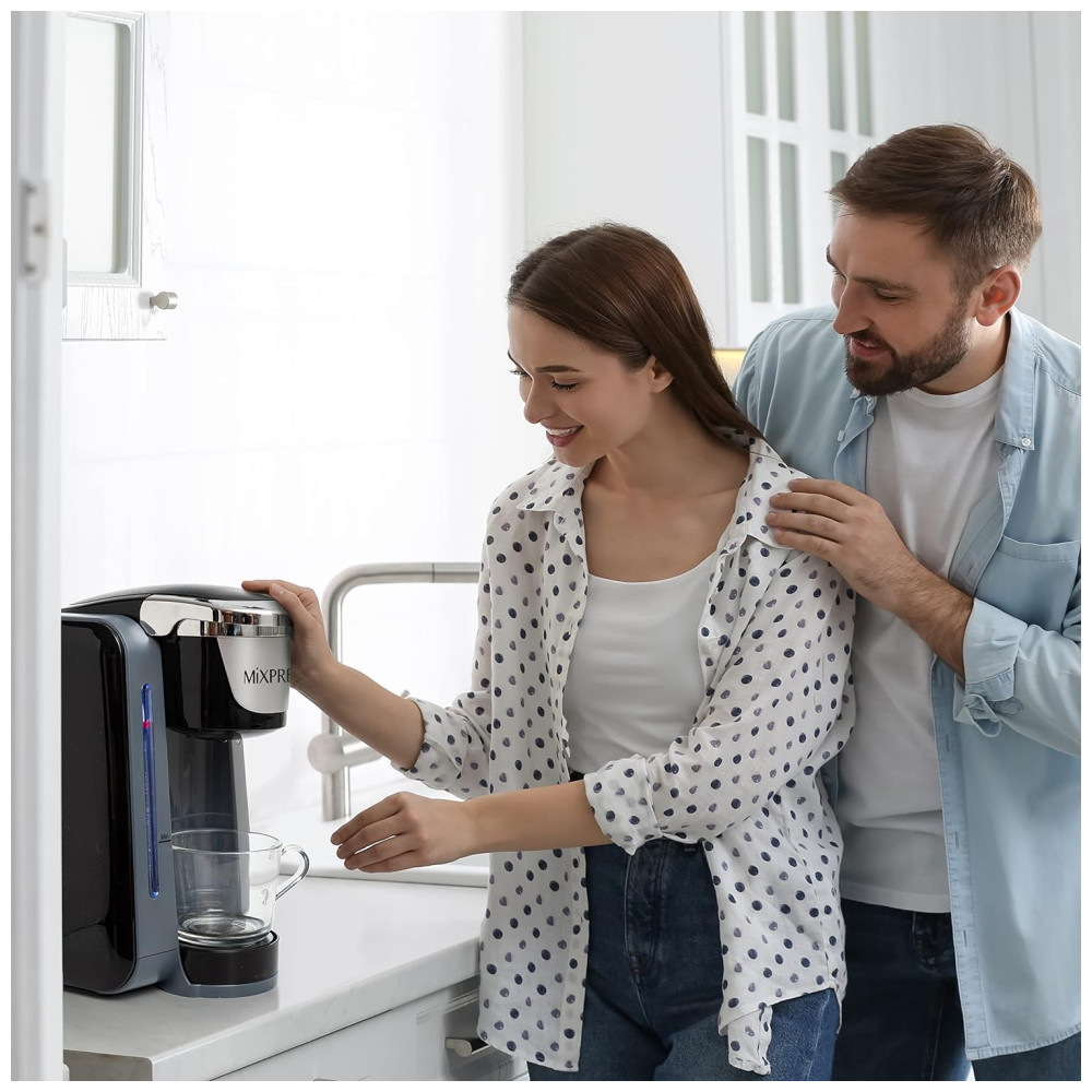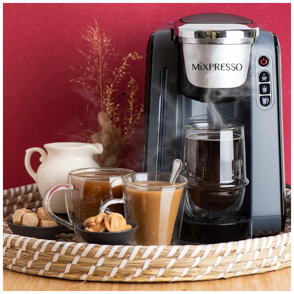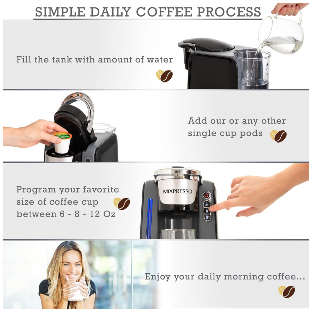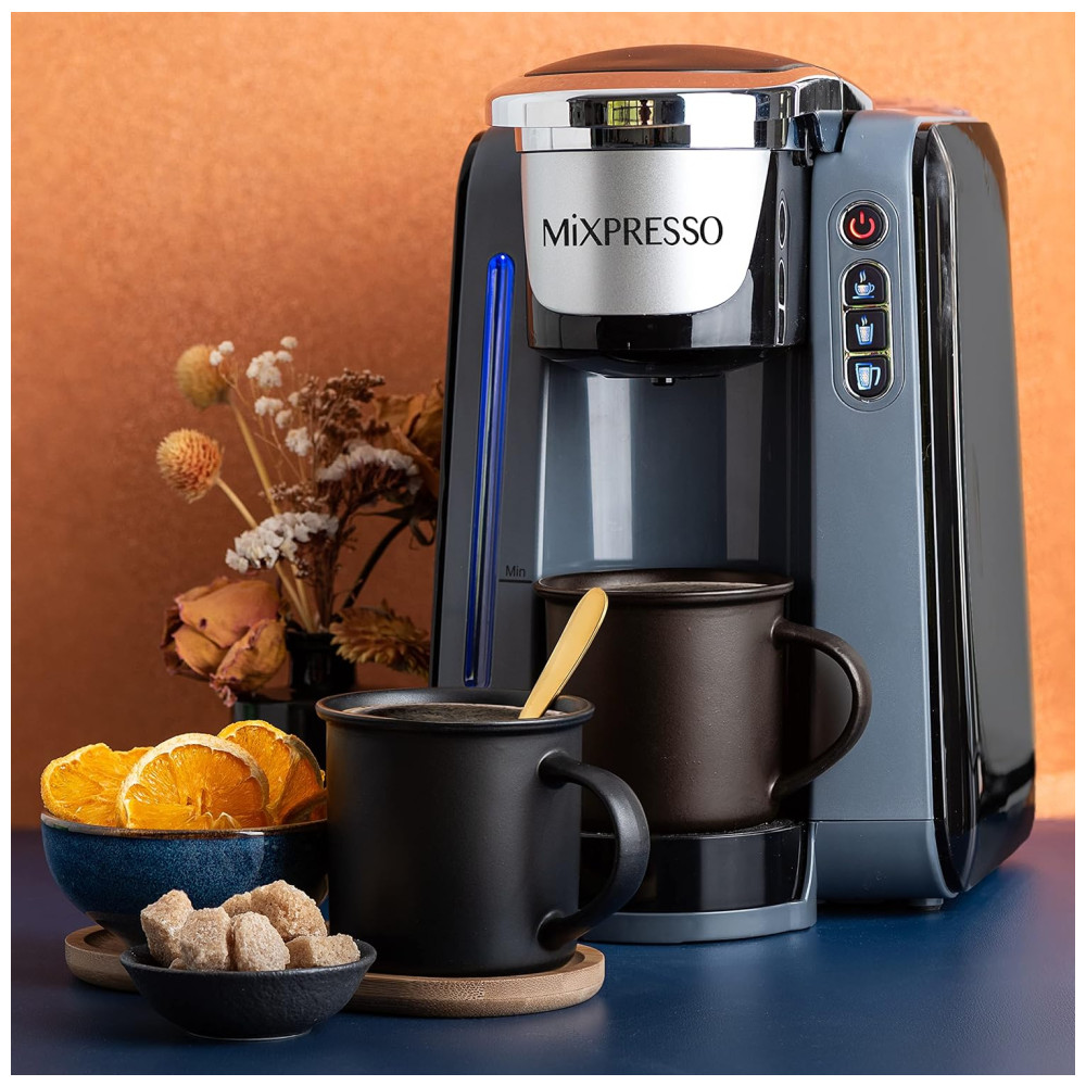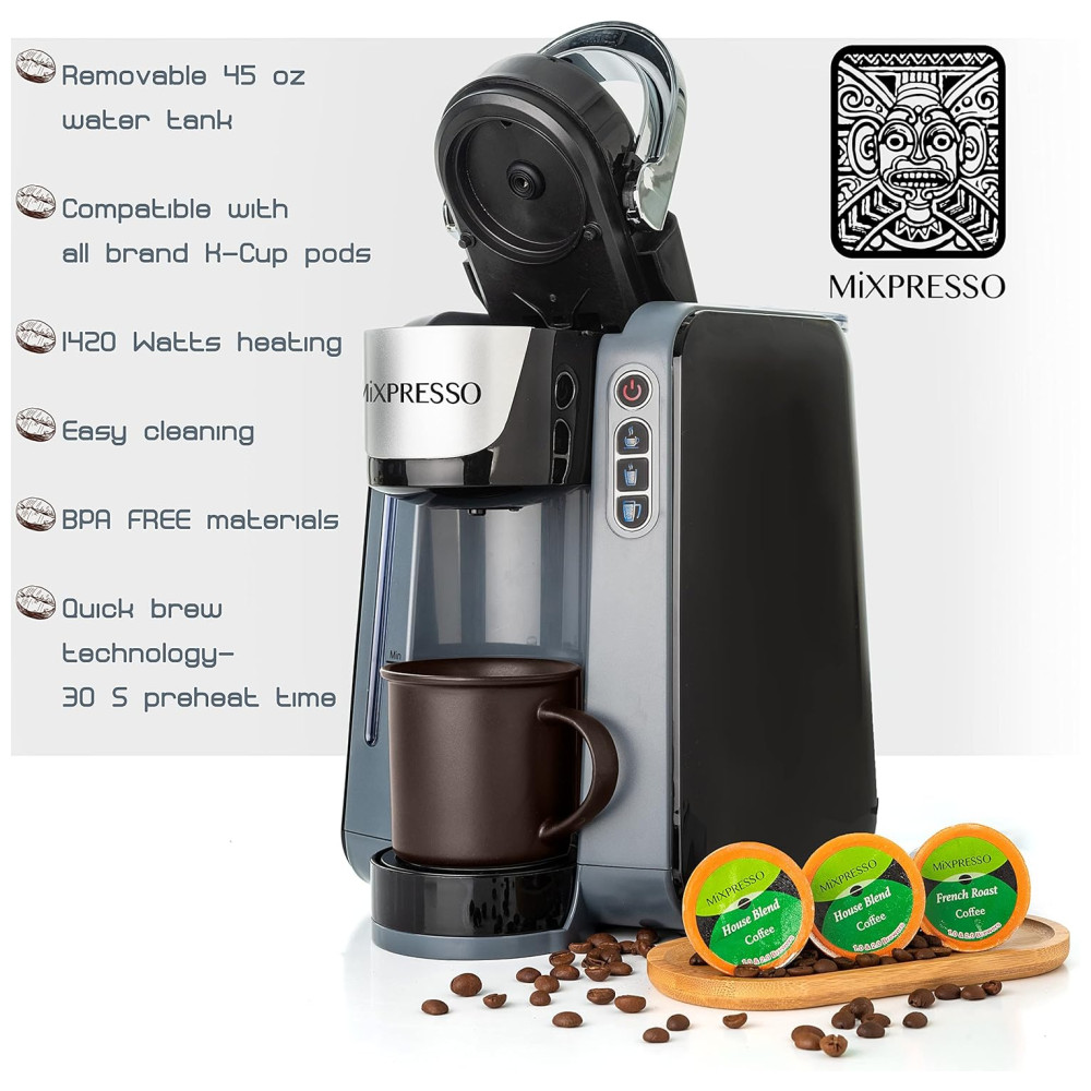 FABRICANTE DE CAFÉ SINGLE CUP A Mixpresso Coffee Maker tem a capacidade de criar o melhor café feito em uma dose única ou xícaras de café expresso com o toque de um único botão com um tanque de água removível de 1.3 Litros. Esta cafeteira de dose única é capaz de preparar uma xícara de café K Cup, chá ou água quente rica, suave e fresca com o filtro reutilizável anexado a ela.
