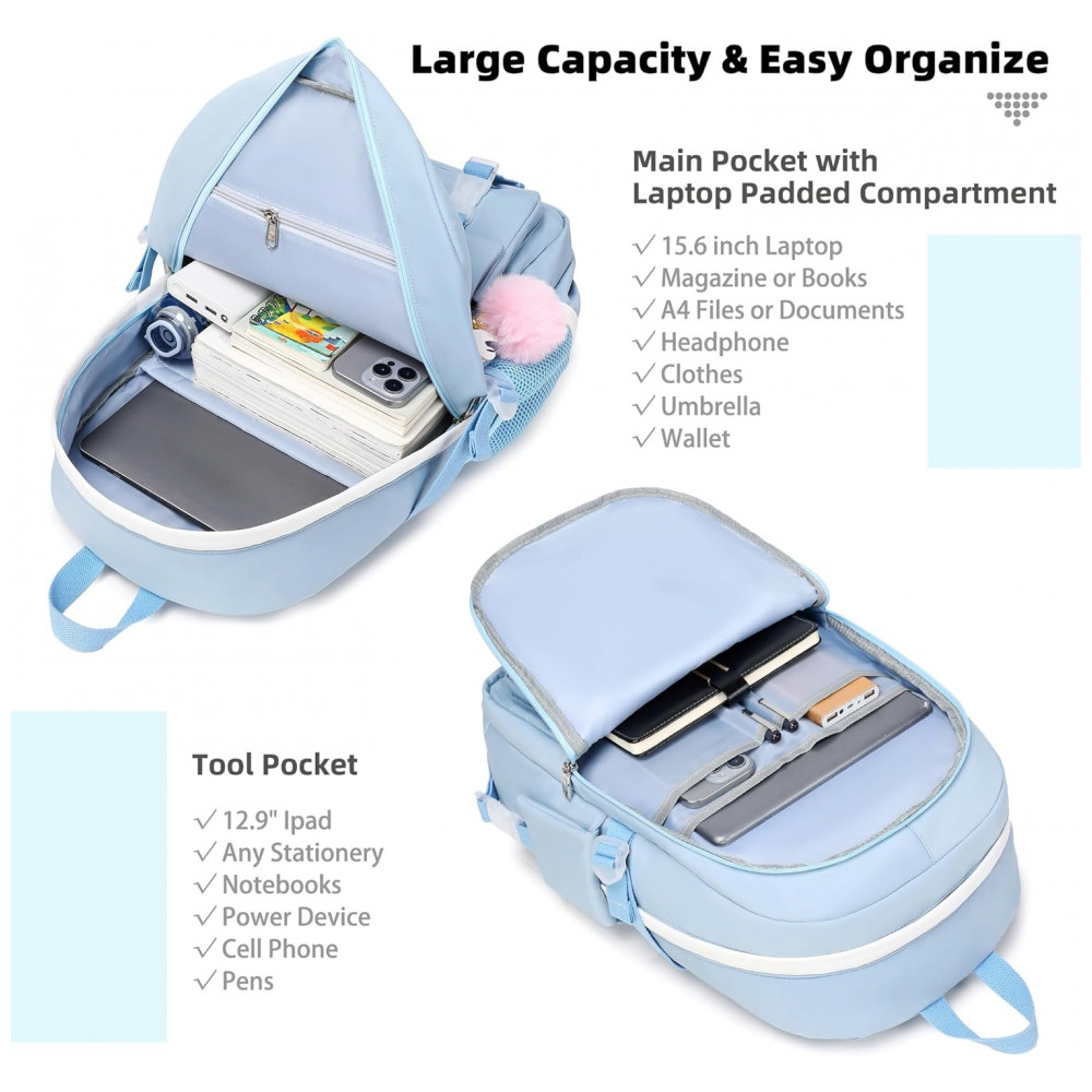 Conjunto 3 em 1 composto por mochila, lancheira e estojo em estilo kawaii, indicado para adolescentes, estudantes universitárias e mulheres que buscam uma mochila para escola, faculdade, trabalho e pequenas viagens. A mochila principal tem aproximadamente 31 cm de largura, 15 cm de profundidade e 45 cm de altura, com compartimento acolchoado que comporta notebooks e tablets de até 16 polegadas, além de acompanhar pingente pompom e badge decorativo.