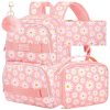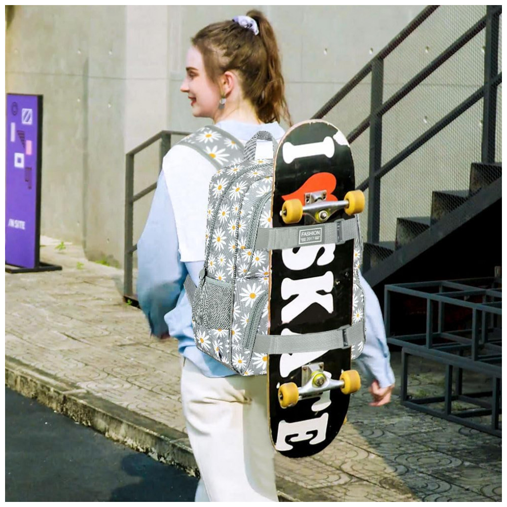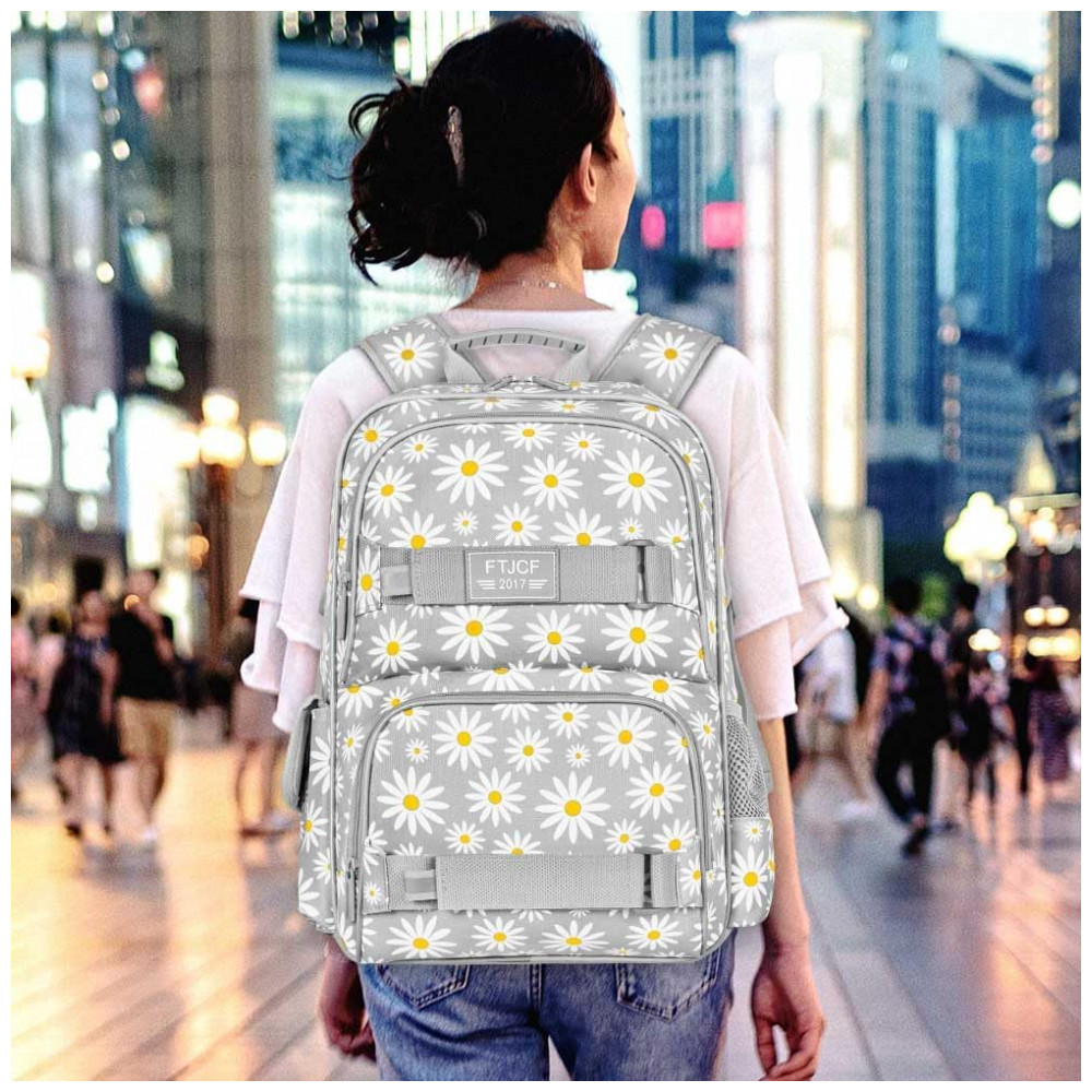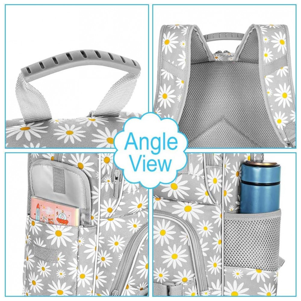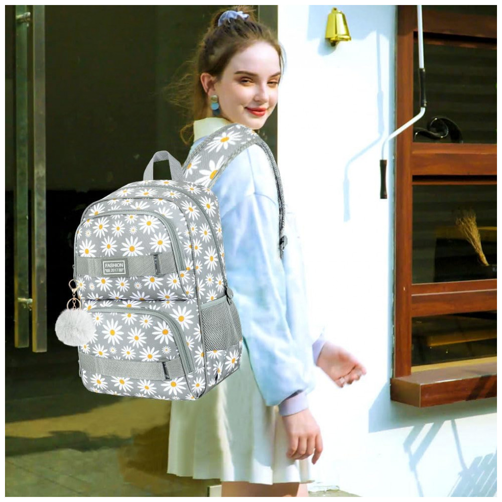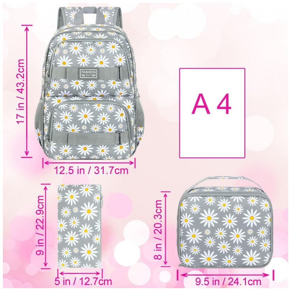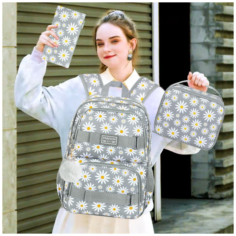 Mochila AGSDON 3 em 1 cinza com estampa de margaridas para notebook 17″ com lancheira e estojo
