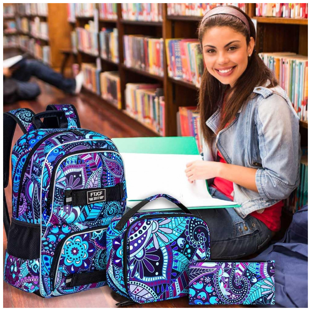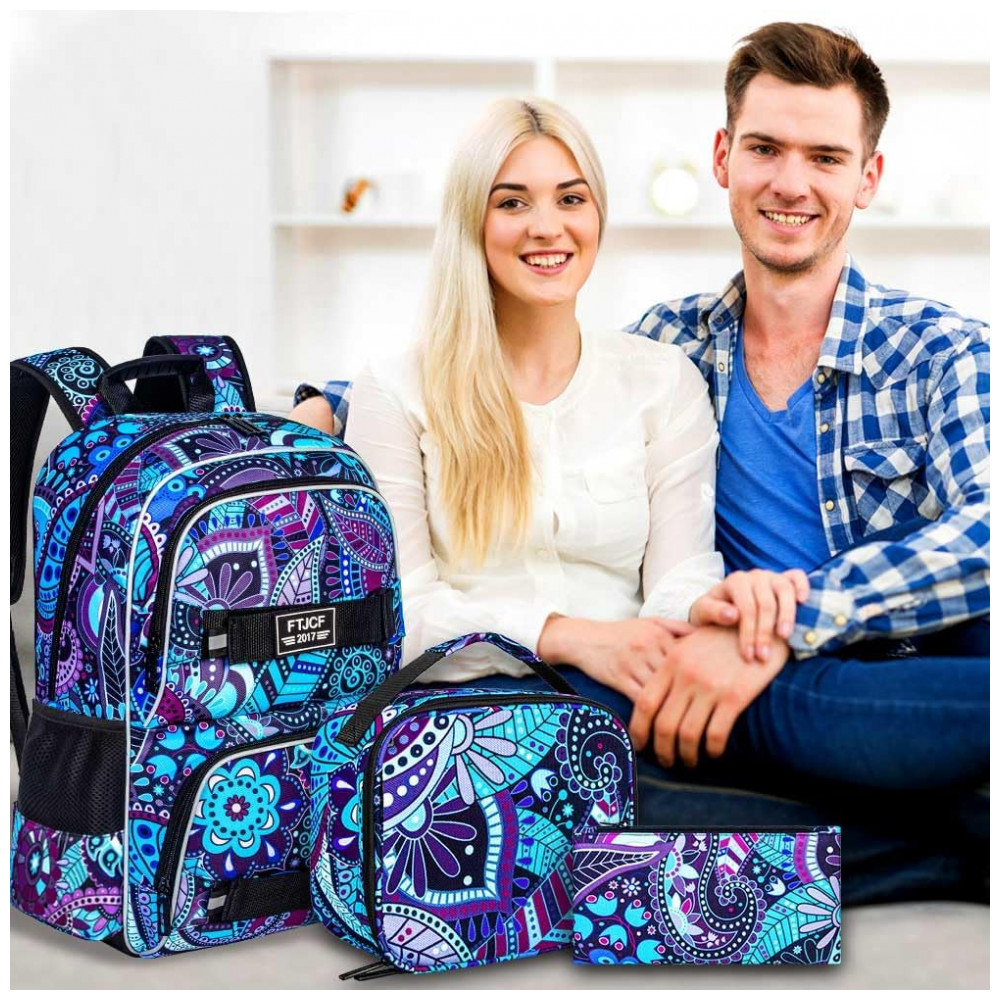 Conjunto 3 em 1 composto por mochila para notebook, lancheira e estojo, com estampa floral em roxo escuro, indicado para adolescentes, jovens e adultos em rotinas de escola, faculdade, trabalho e uso diário. A mochila principal comporta notebook de até 17″, livros, cadernos, pasta A4, estojo, carregadores e acessórios, enquanto a lancheira e o estojo complementam o conjunto para transporte de refeições e materiais de escrita.