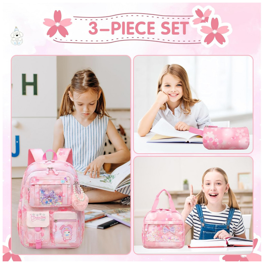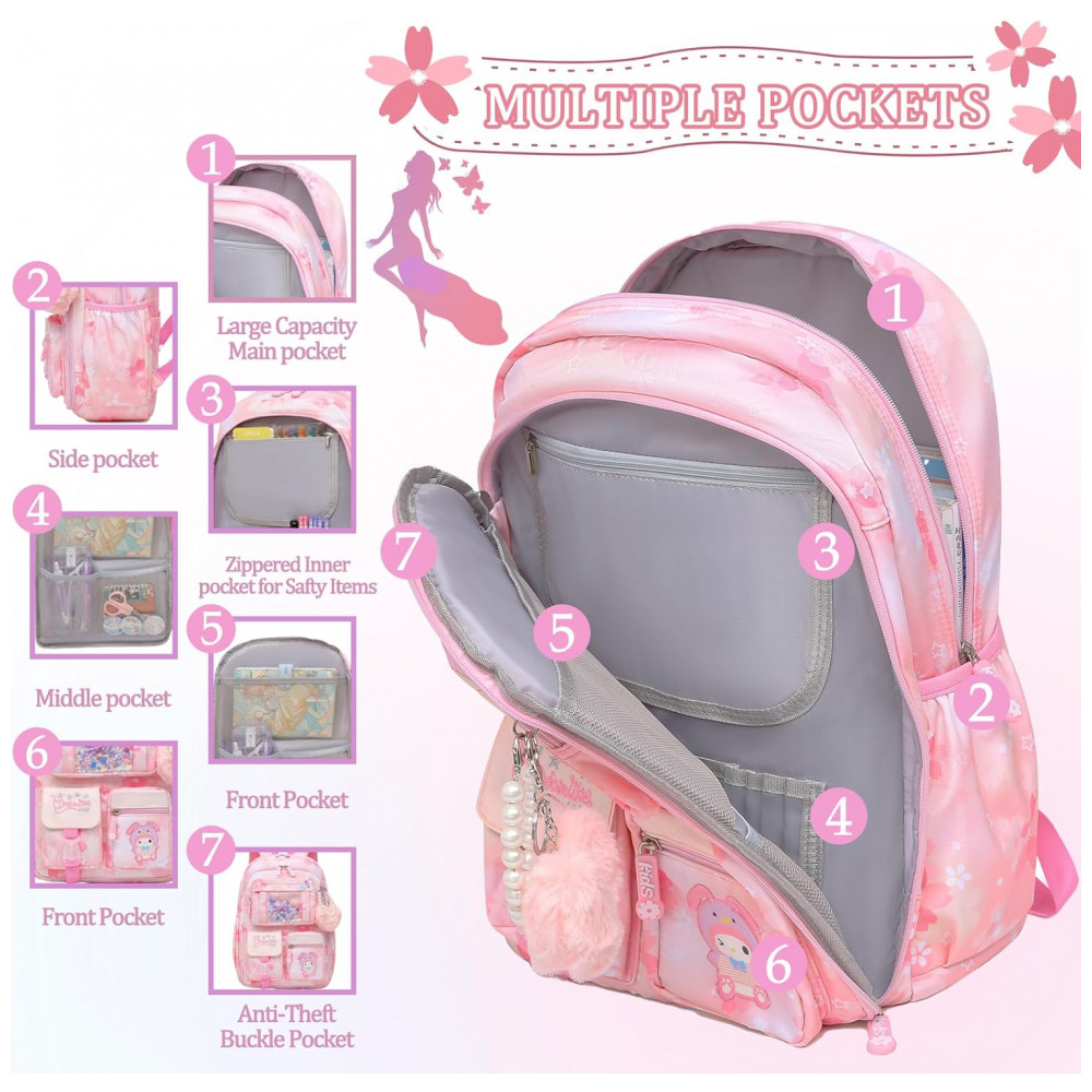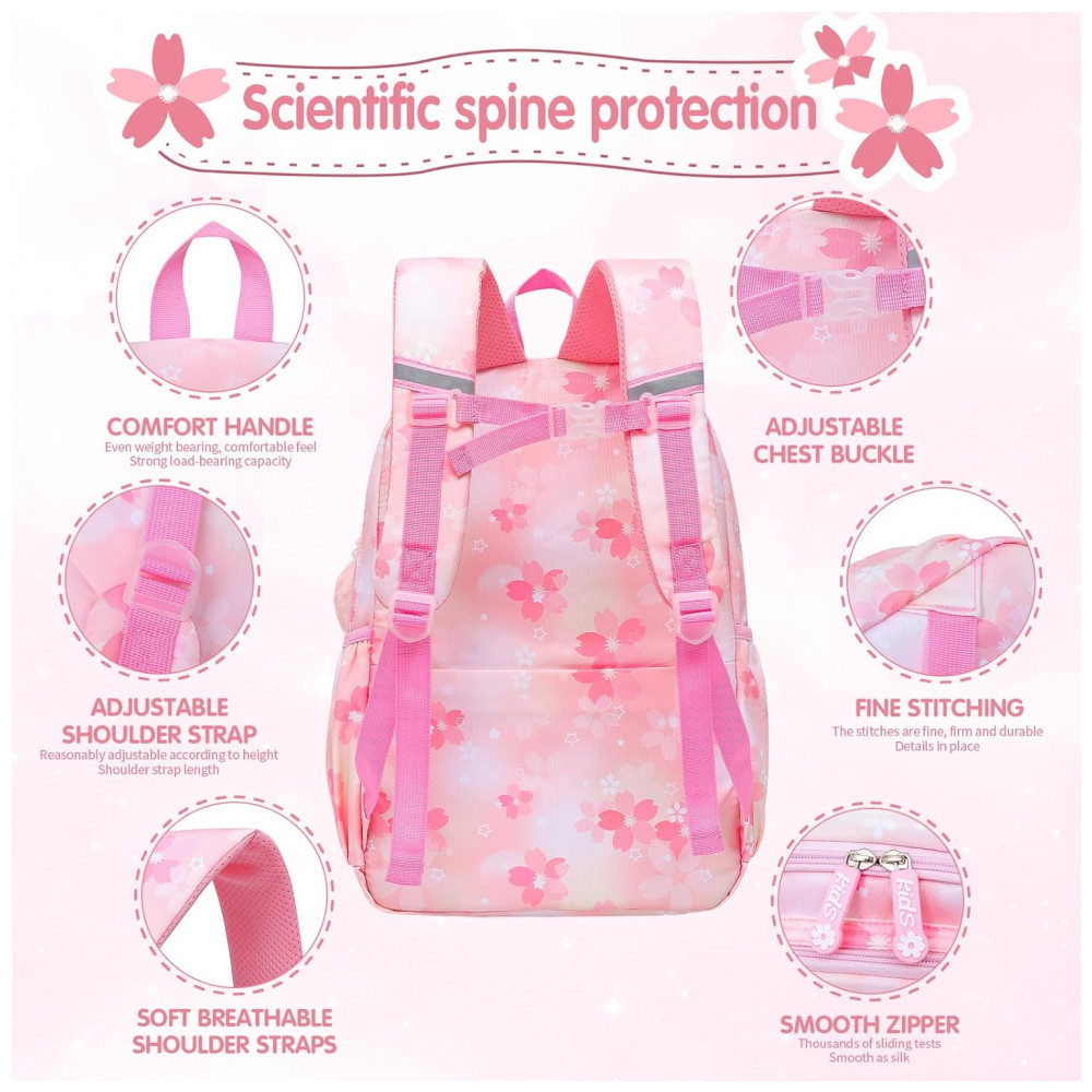 O tecido é resistente a rasgos e respingos, com alças de ombro largas e acolchoadas e painel traseiro respirável para maior conforto ao longo do dia. Os múltiplos bolsos e compartimentos facilitam a organização de materiais, enquanto o visual em tons de rosa torna a mochila adequada tanto para ambiente escolar quanto para uso em viagens curtas e atividades diárias.