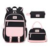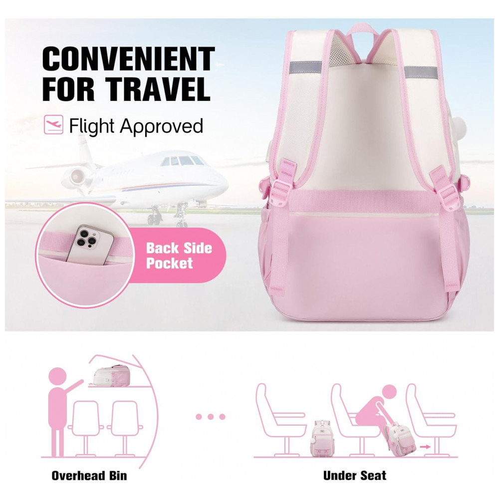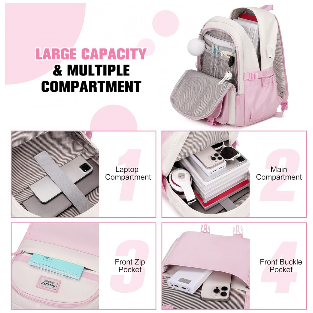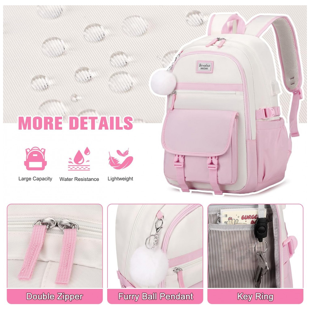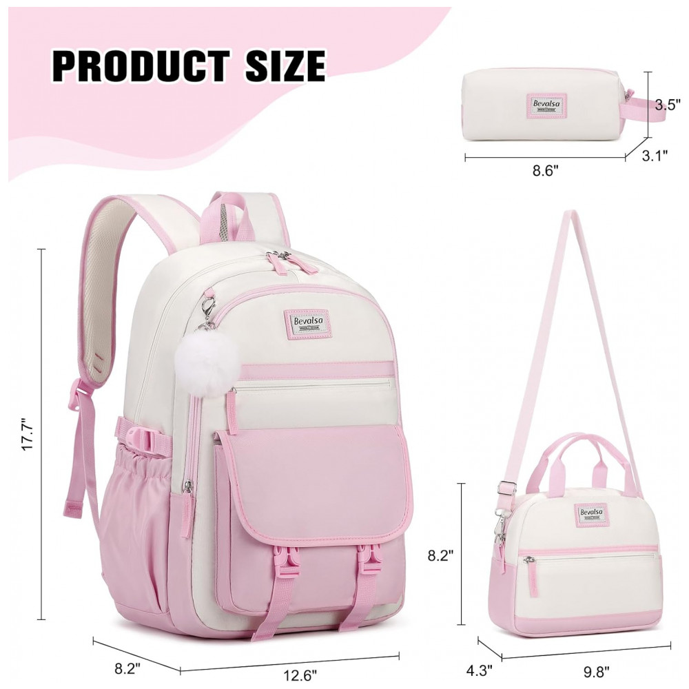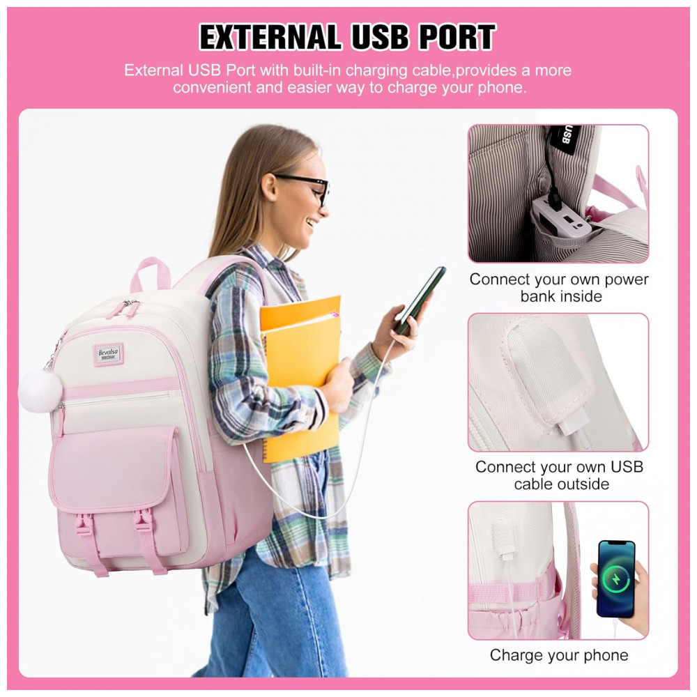 Mochila Bevalsa 3 em 1 rosa e bege com lancheira e estojo para notebook até 156″ e porta USB