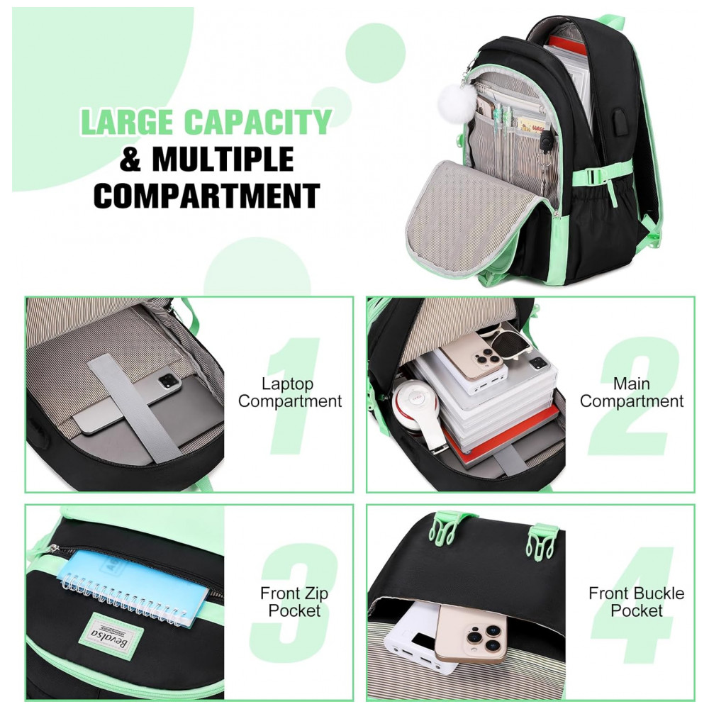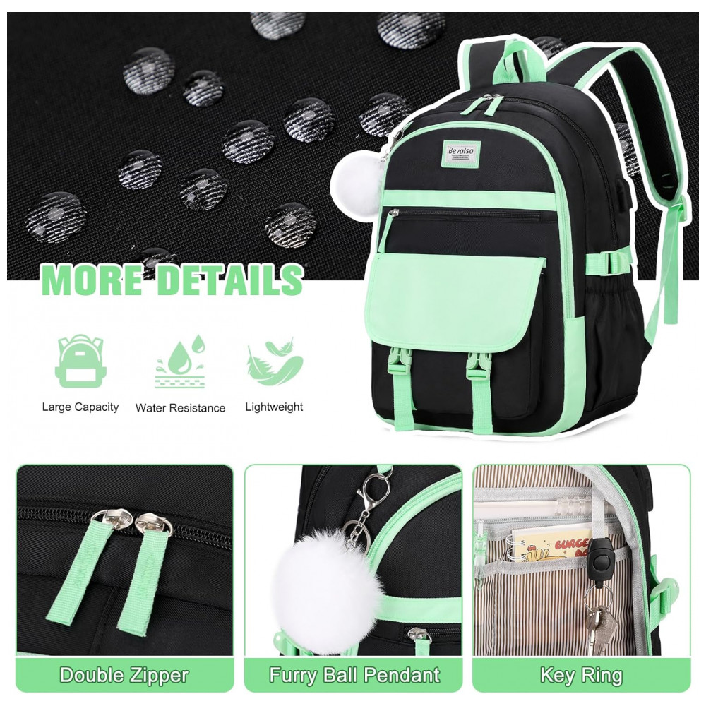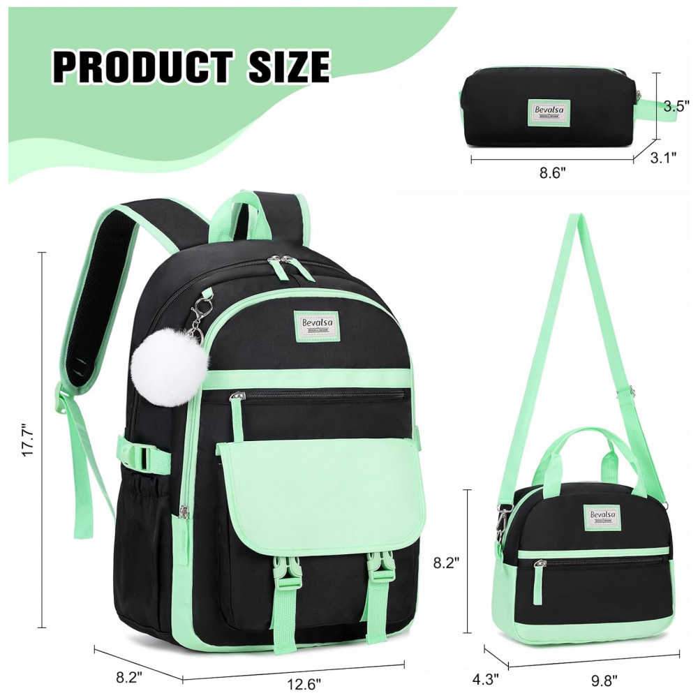 Mochila Bevalsa 3 em 1 verde e preta com lancheira e estojo para notebook até 156″
