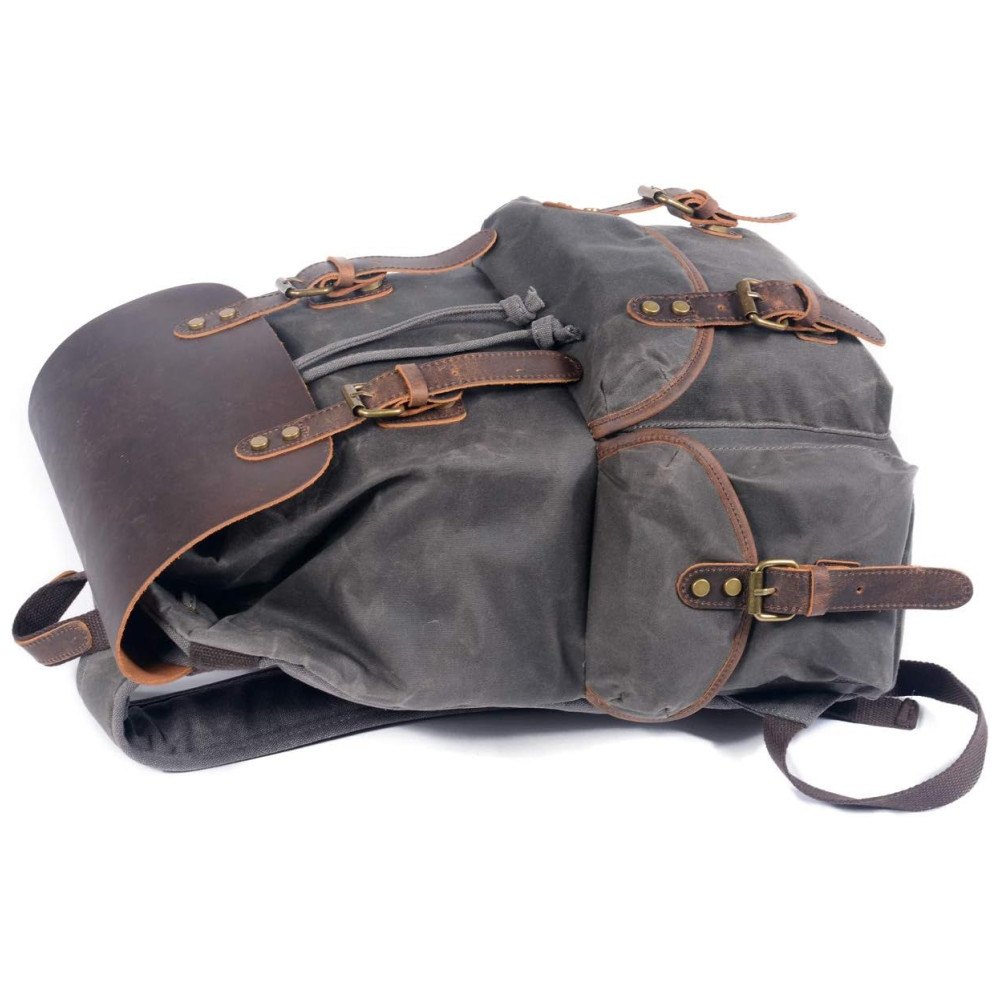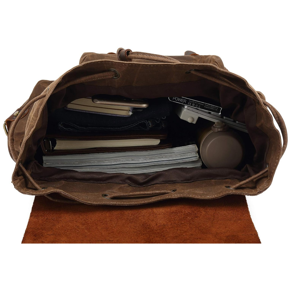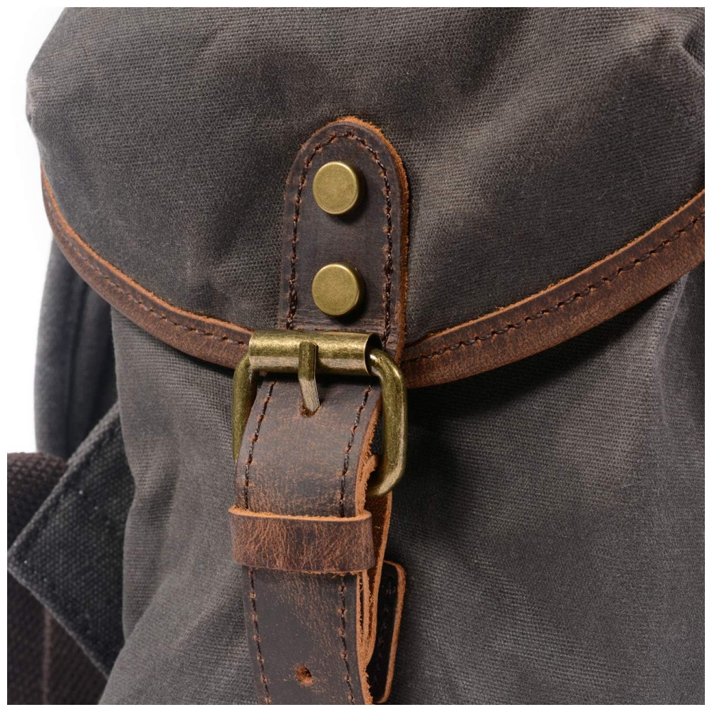 Mochila com aba de lona encerada, encerado à prova dágua, aba superior de couro Crazy Horse marrom resistente e cintos, ferragens de cobre, fechos magnéticos, cordão na parte superior, bolsos funcionais, design clássico que nunca fica atrás da tendência.