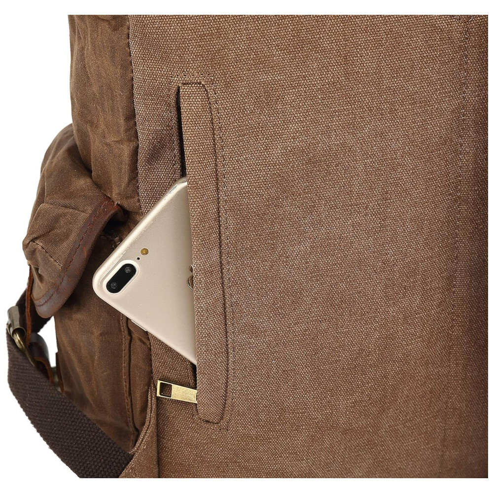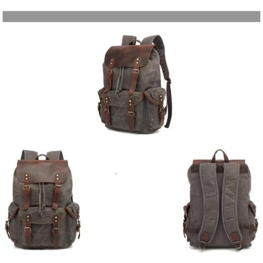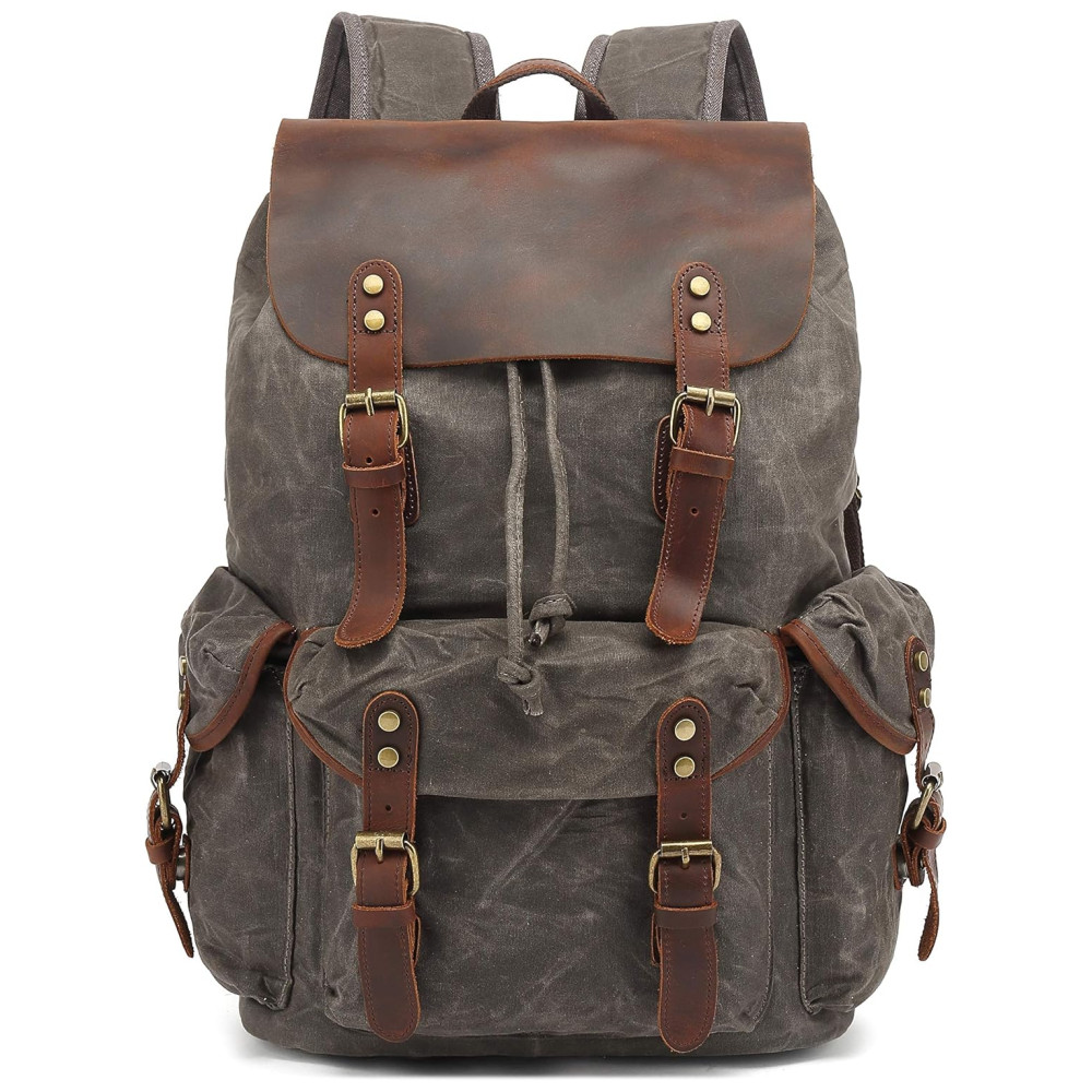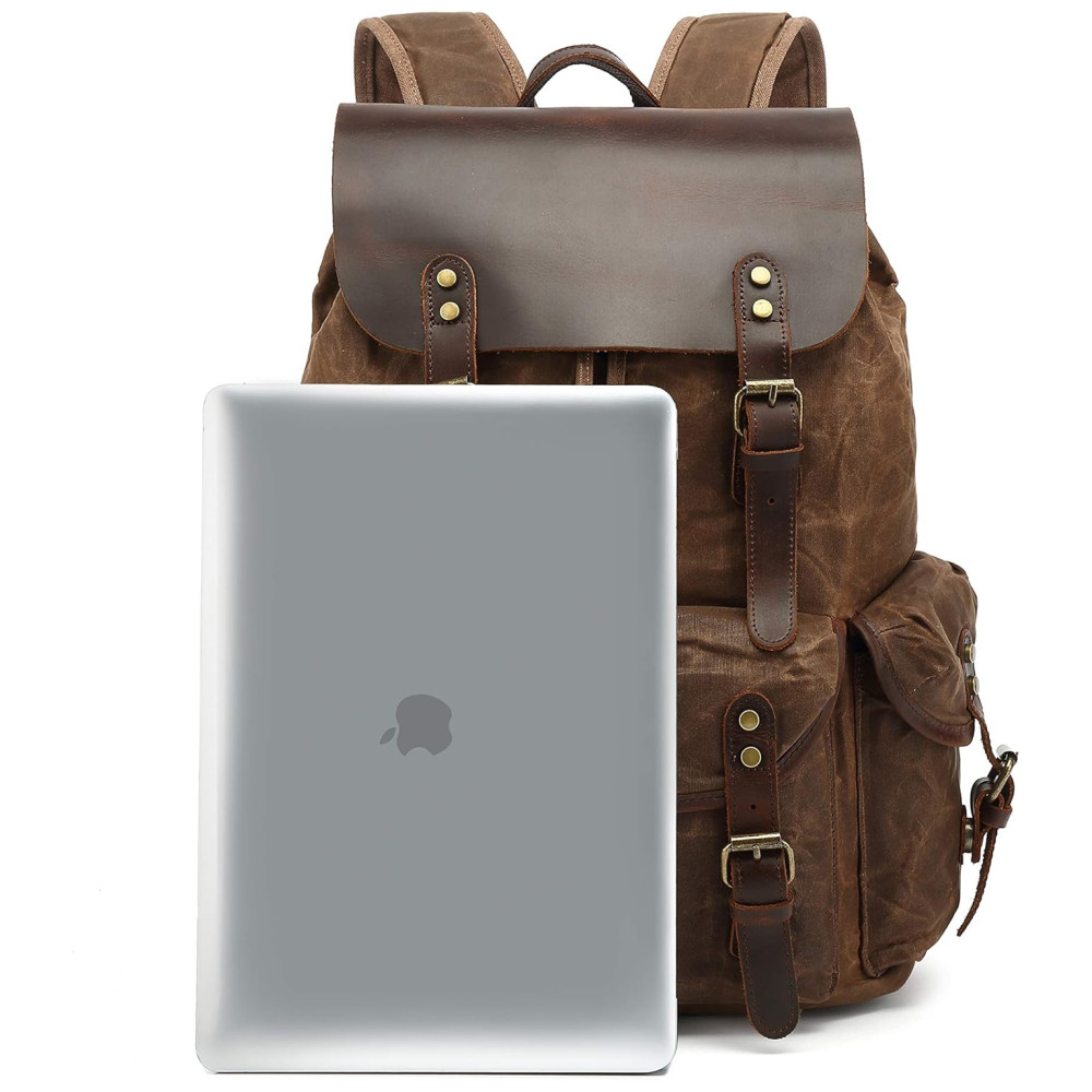 Mochila com aba de lona encerada, encerado à prova dágua, aba superior de couro Crazy Horse marrom resistente e cintos, ferragens de cobre, fechos magnéticos, cordão na parte superior, bolsos funcionais, design clássico que nunca fica atrás da tendência.