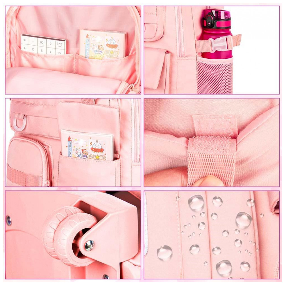 Conjunto 3 em 1 composto por mochila de rodinhas, lancheira e estojo, indicado para adolescentes, estudantes e mulheres que precisam de um conjunto escolar e de viagem com boa capacidade de organização. A mochila principal pode ser usada nas costas ou como mala com rodinhas, oferecendo compartimento principal amplo com bolso acolchoado para laptop, compartimento intermediário com divisórias, bolsos frontais e bolsos laterais em tela para garrafa.