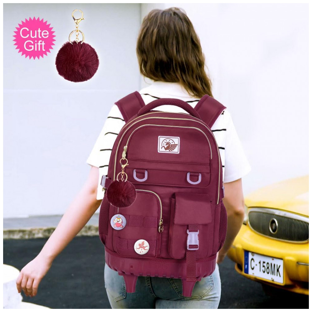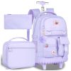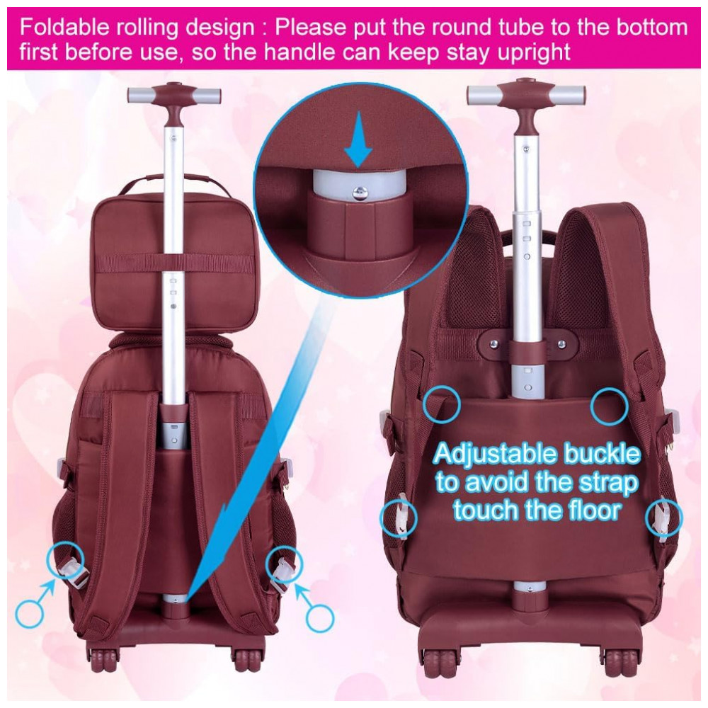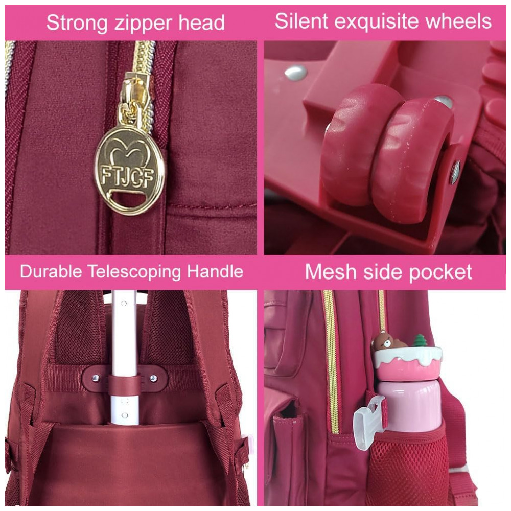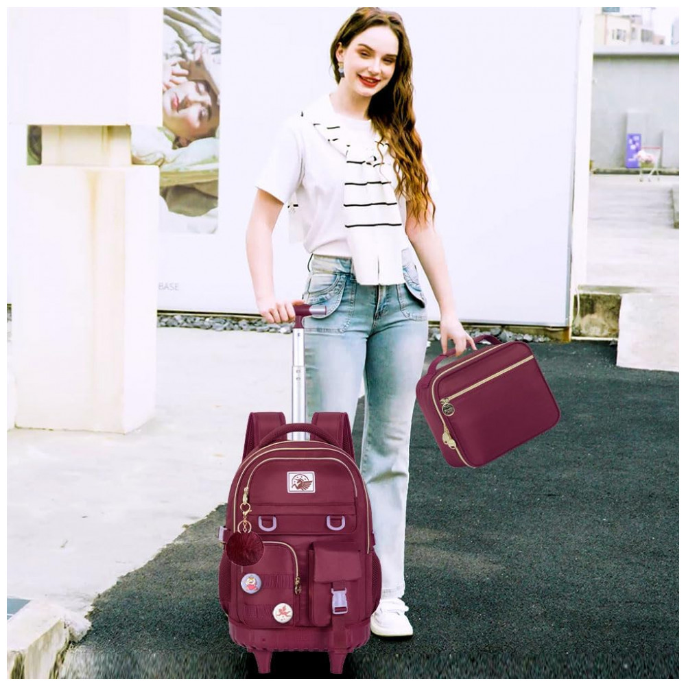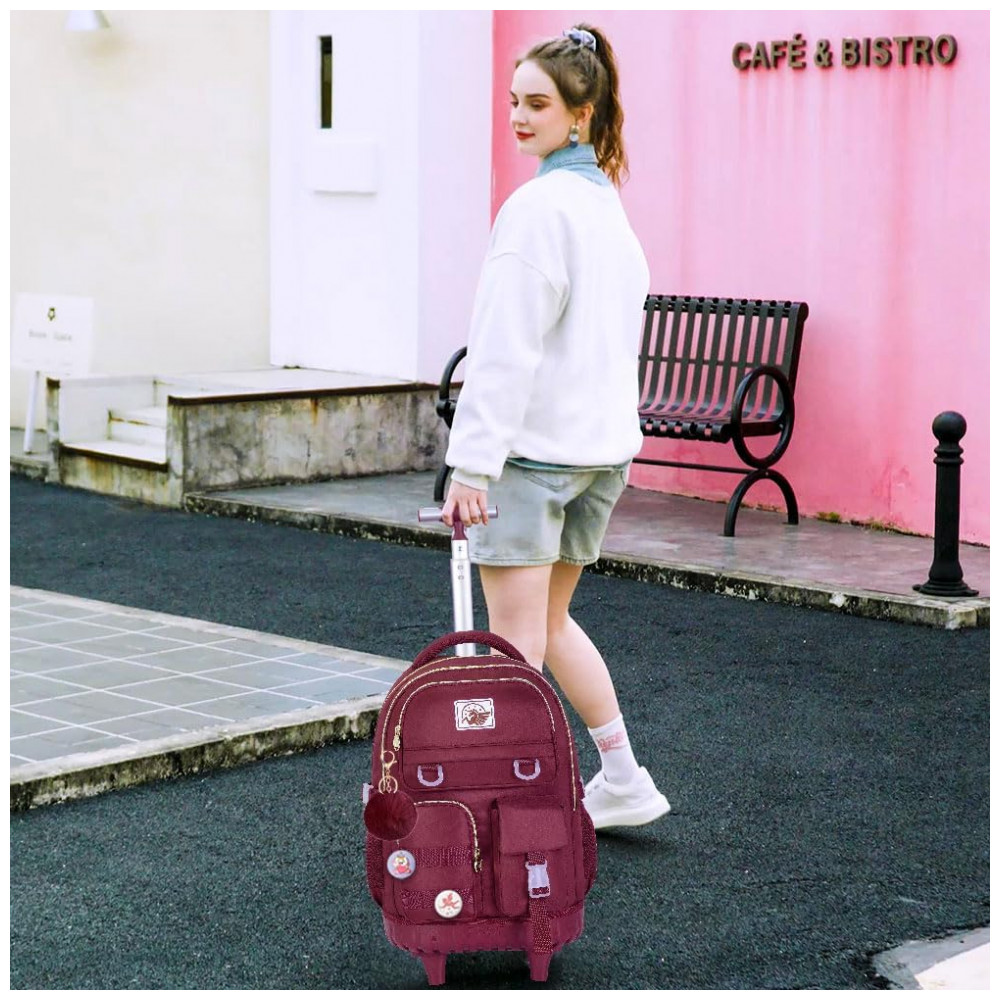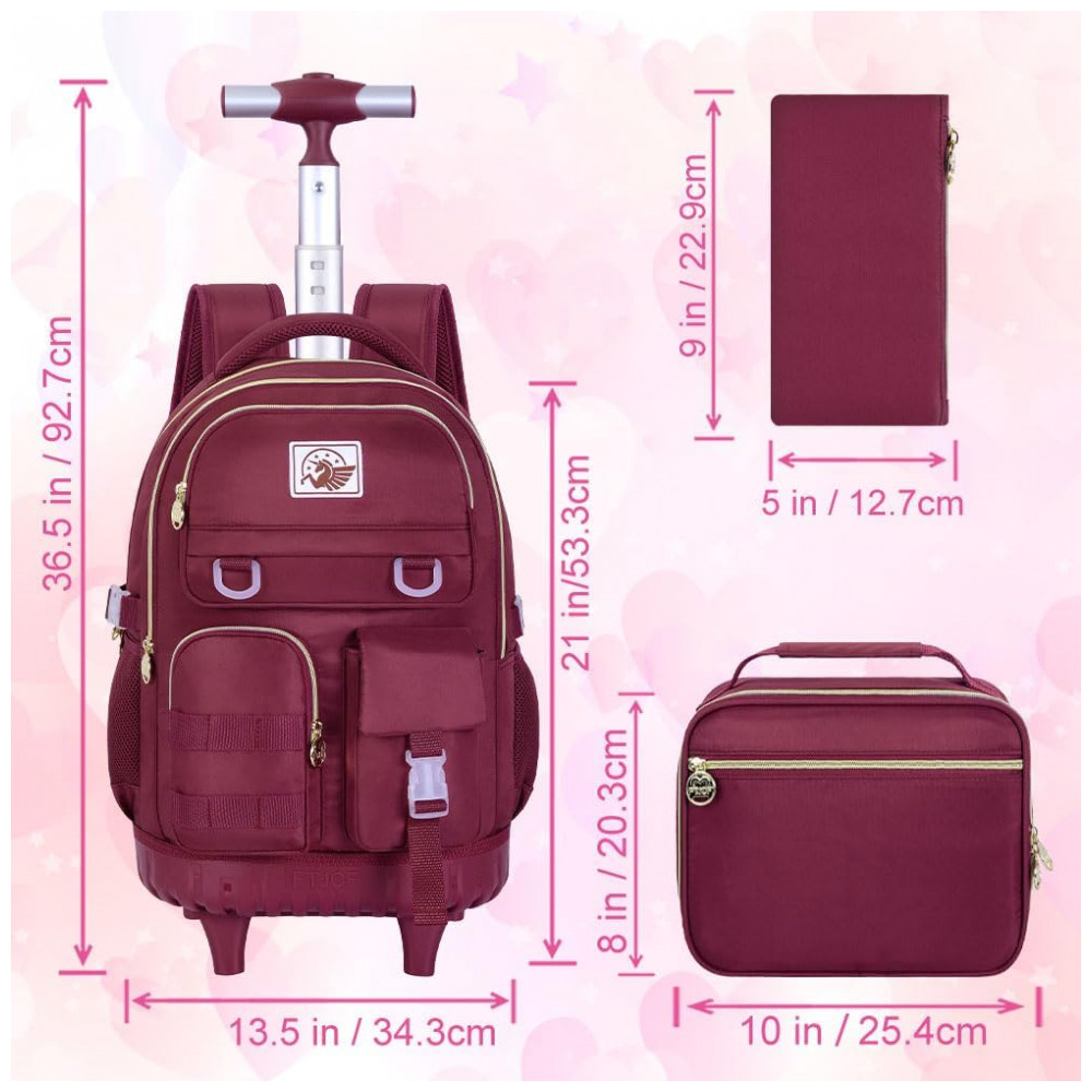 Conjunto 3 em 1 composto por mochila de rodinhas, lancheira e estojo, indicado para adolescentes, estudantes e mulheres que precisam de um conjunto escolar e de viagem com boa capacidade de organização. A mochila principal pode ser usada nas costas ou como mala com rodinhas, oferecendo compartimento principal amplo com bolso acolchoado para laptop, compartimento intermediário com divisórias, bolsos frontais e bolsos laterais em tela para garrafa.