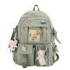 O tecido externo é leve, resistente à abrasão e com revestimento que ajuda a repelir água da chuva, combinado a zíperes metálicos de deslizamento suave. As alças de ombro duplas são acolchoadas e ajustáveis, ajudando a reduzir a pressão nos ombros, enquanto os acessórios decorativos – pinos, pingente de pelúcia e cartões – reforçam o estilo casual e jovem, fácil de combinar com diferentes looks.