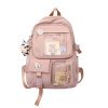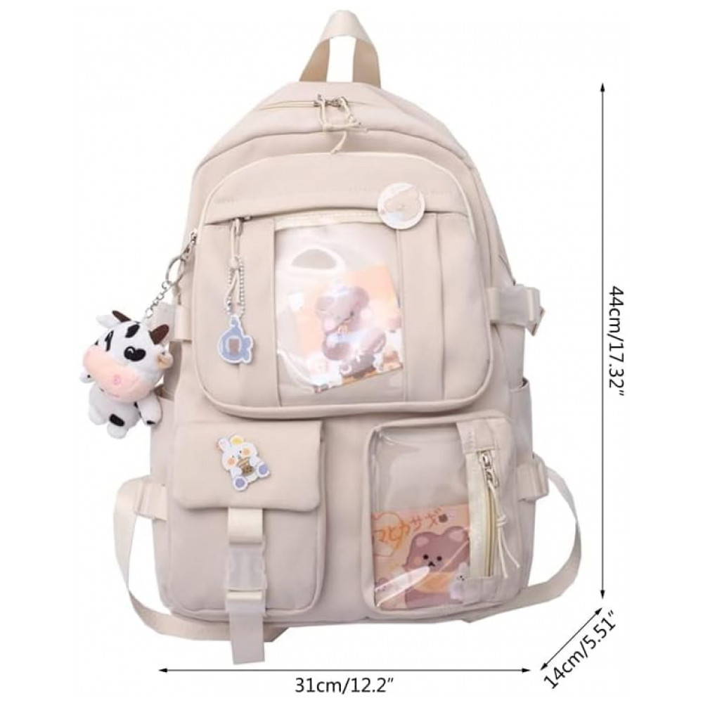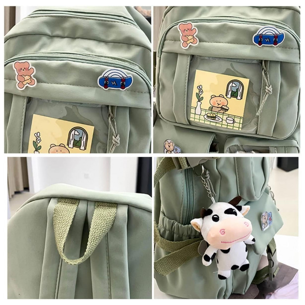 A estrutura utiliza tecido leve, resistente à abrasão e com tratamento para repelência à água, com zíperes metálicos de deslizamento suave. As alças de ombro são duplas, acolchoadas e ajustáveis, ajudando a distribuir o peso de forma mais confortável, enquanto os acessórios decorativos, como pinos, pingente de pelúcia e cartões, reforçam a estética casual para uso em escola, universidade, cursinhos e uso urbano diário.