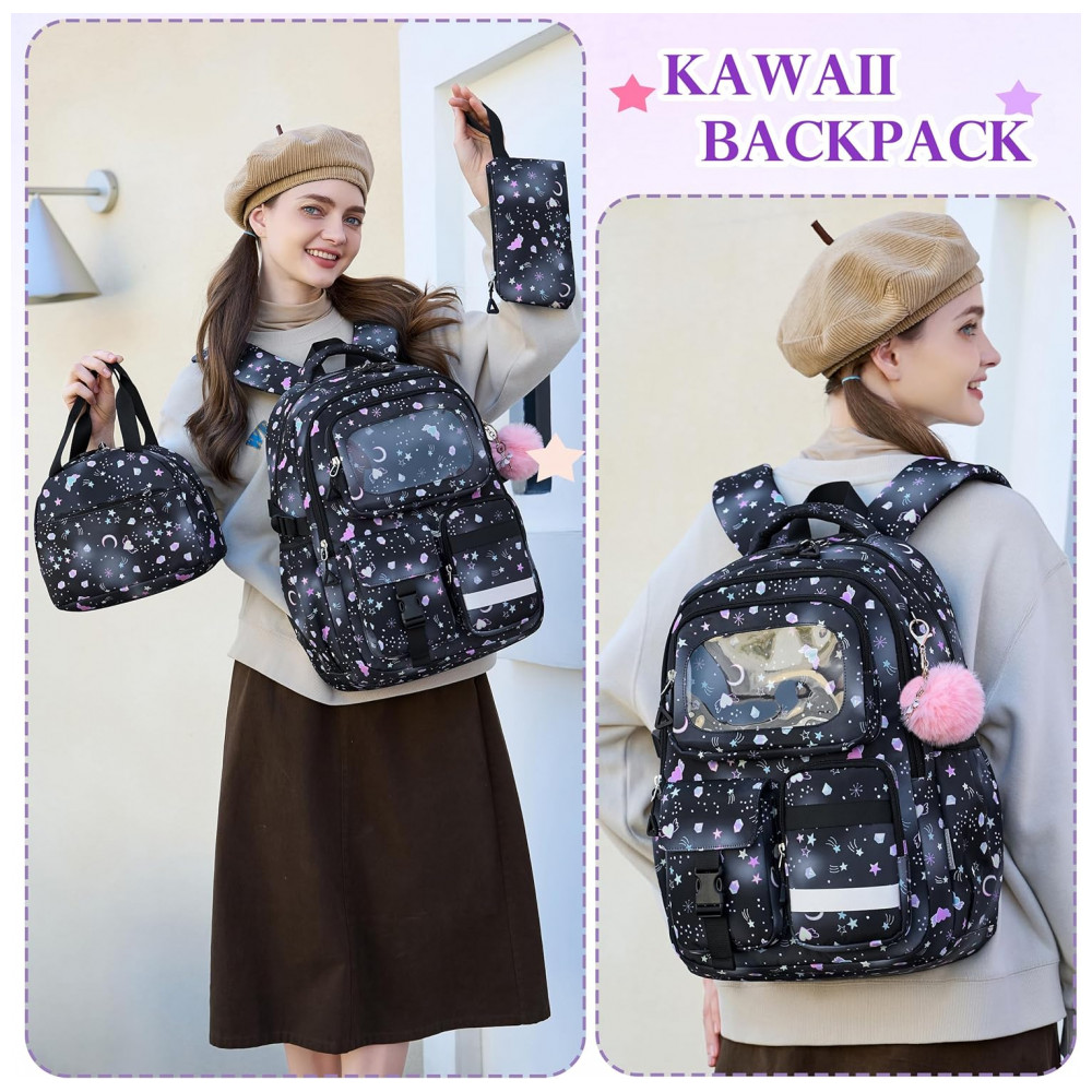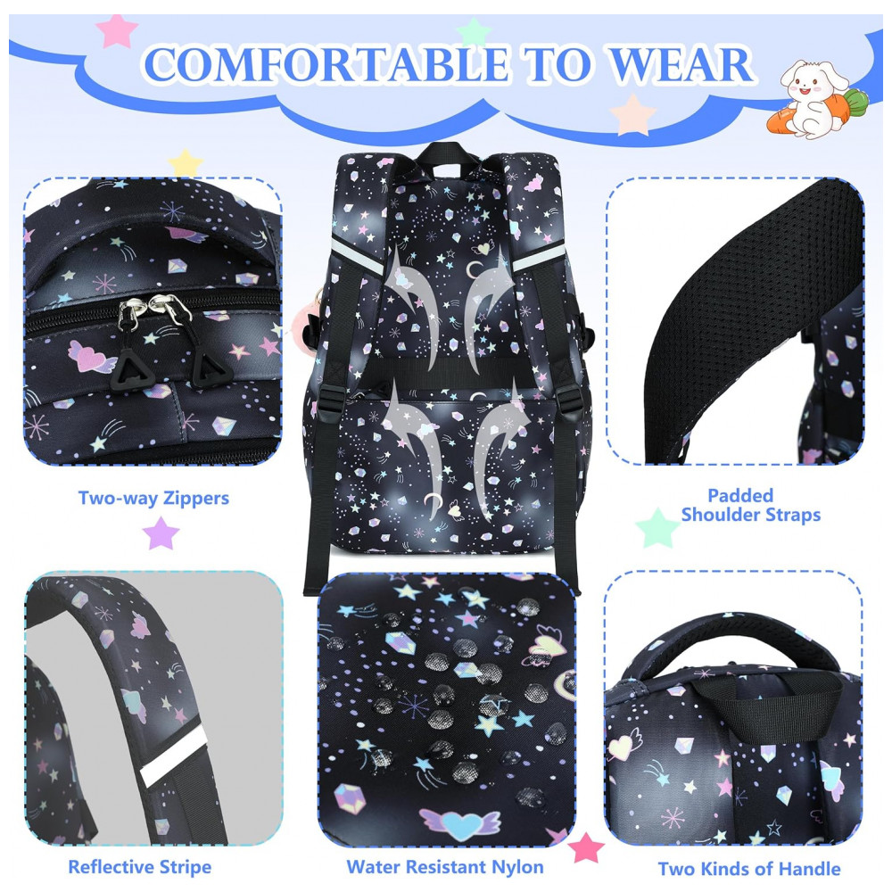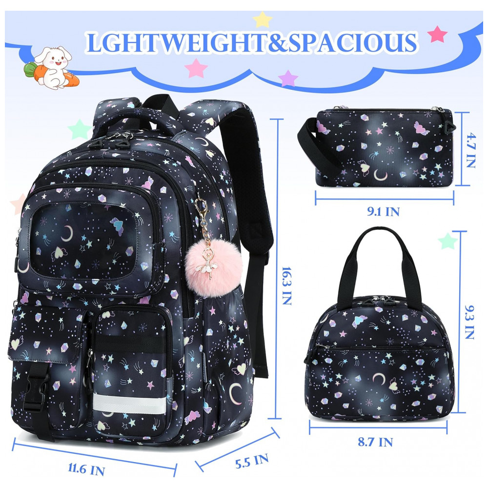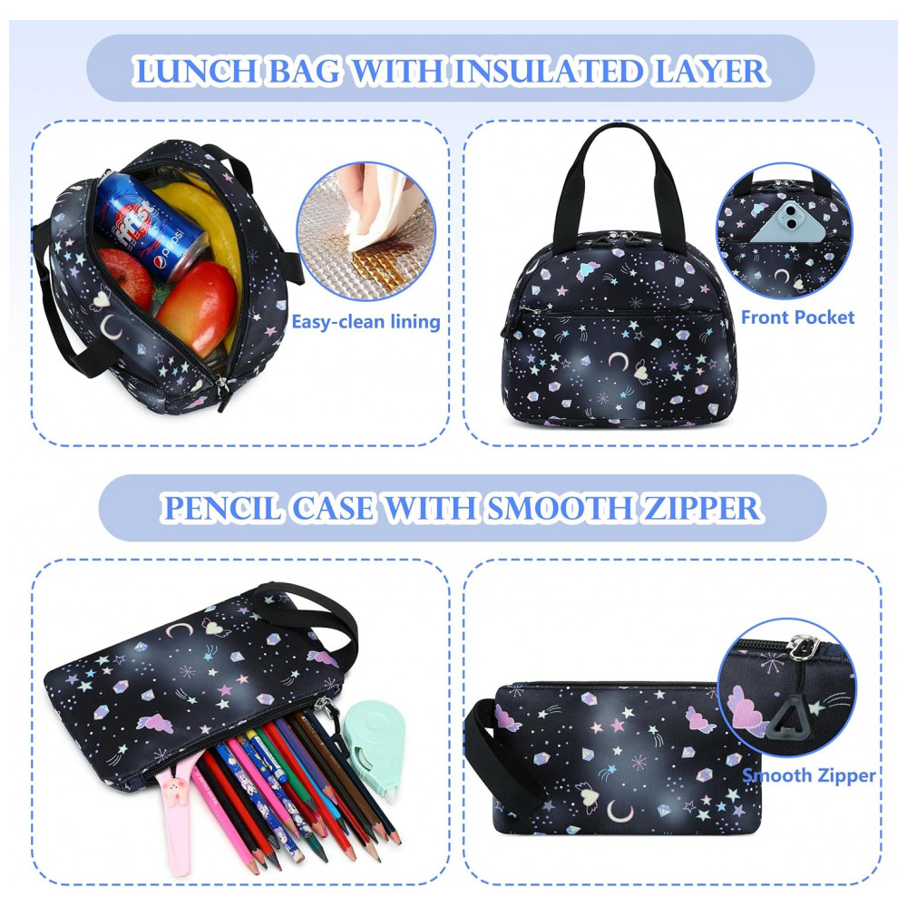 O conjunto é produzido em nylon 900D com revestimento resistente à água, zíperes de abertura suave e costuras reforçadas, voltado para maior durabilidade no uso escolar. As alças de ombro em formato S são acolchoadas e ajustáveis, com painel traseiro acolchoado para melhor distribuição de peso, enquanto o peso total aproximado de 1,10 kg para as três peças contribui para um transporte mais confortável para crianças e adolescentes.