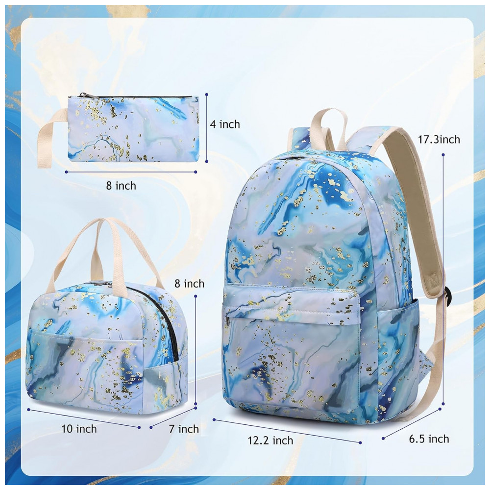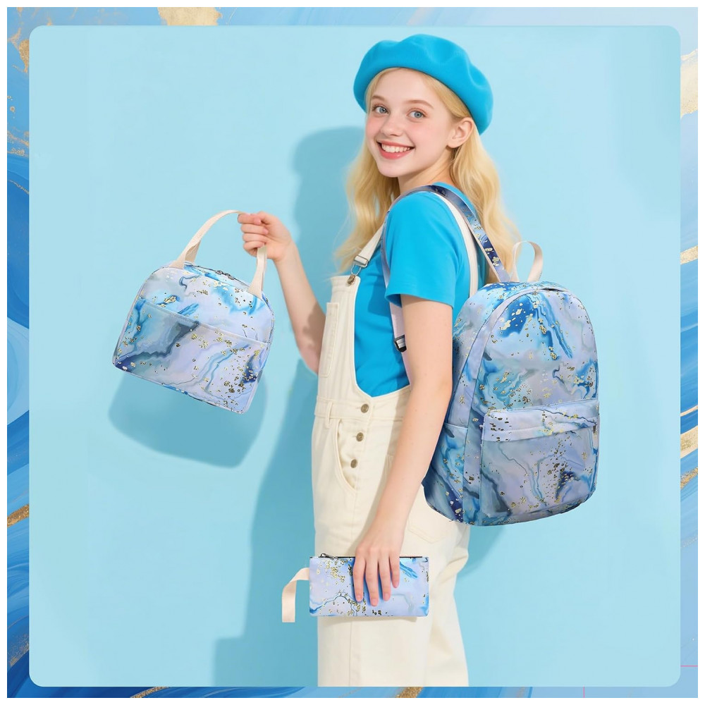 Conjunto escolar Bluboon 3 em 1 composto por mochila, lancheira térmica e estojo, indicado para meninas e adolescentes em rotina escolar, viagens e uso diário. A mochila possui compartimento interno com acolchoamento para notebook de até 35,5 cm, espaço para fichários, cadernos, livros e materiais escolares, além de bolso frontal com zíper e bolsos laterais para garrafas.