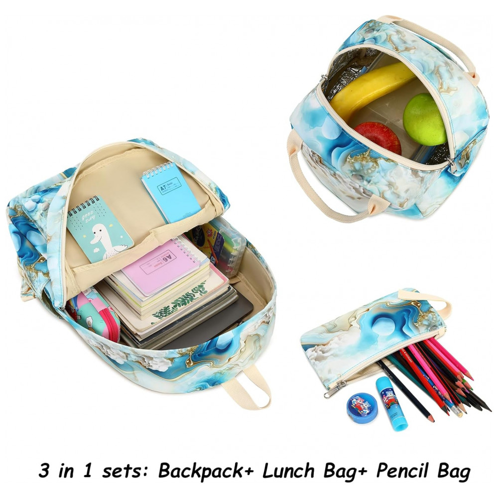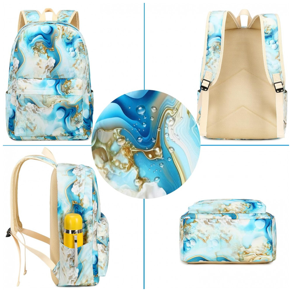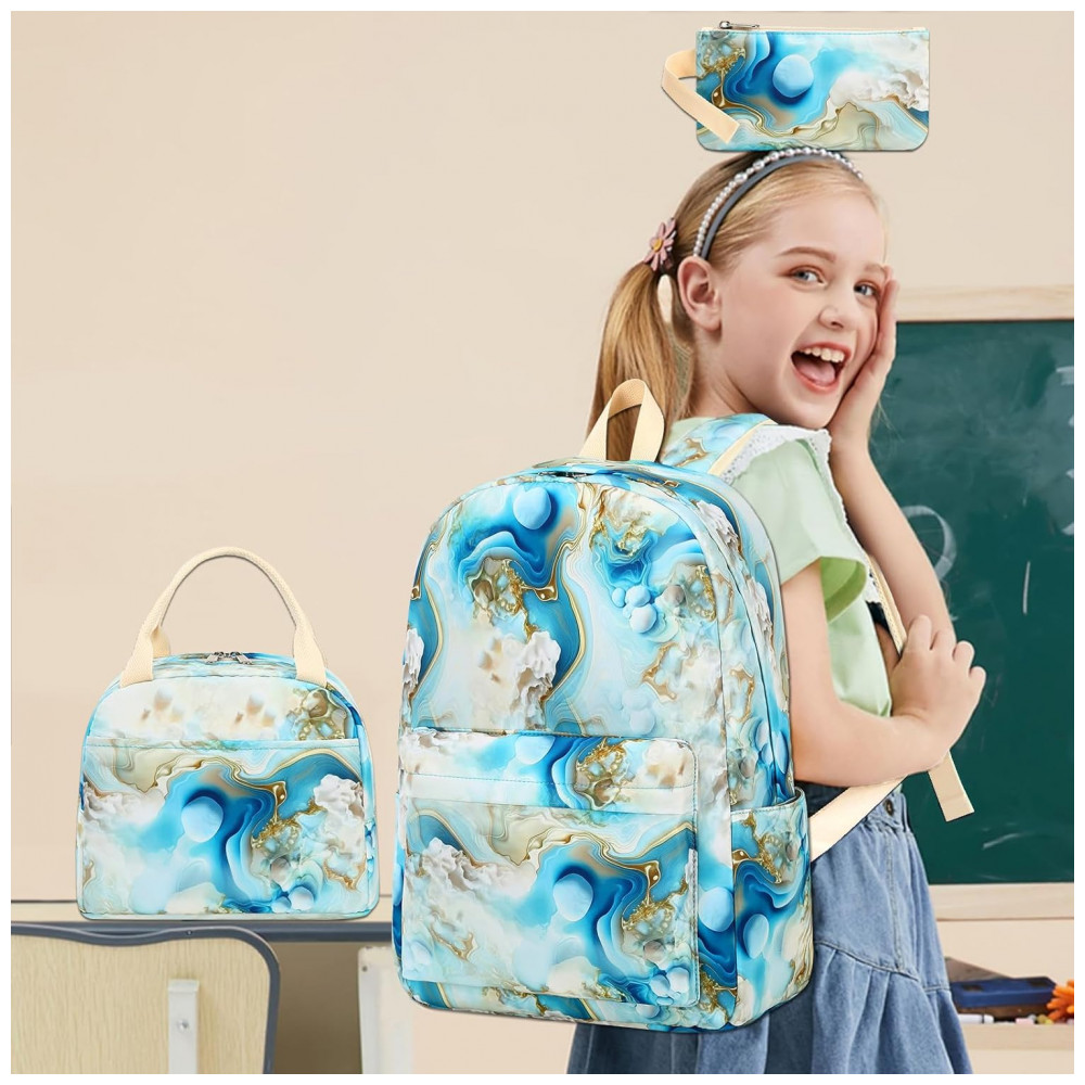 Mochila escolar Bluboon juvenil feminina azul e branco marmorizado conjunto 3 peças com bolsa lateral e estojo para notebook 355 cm