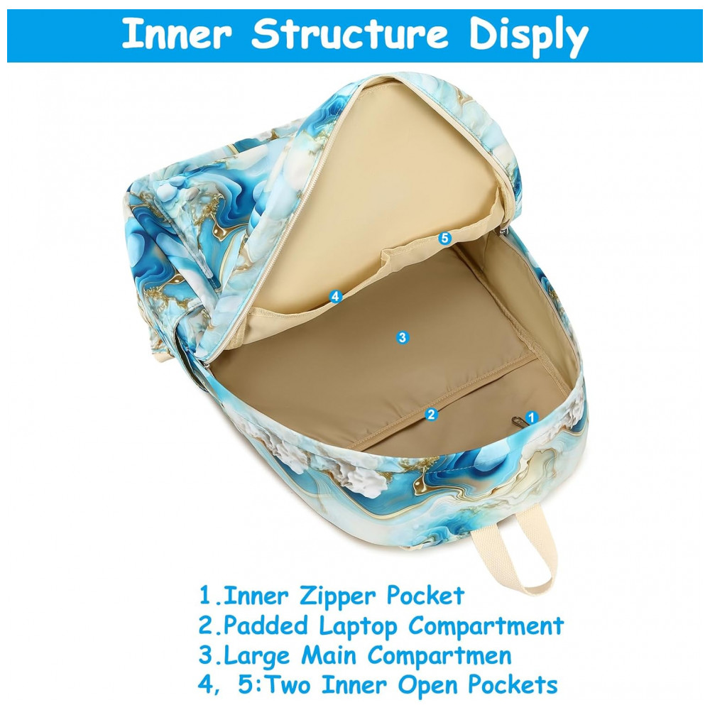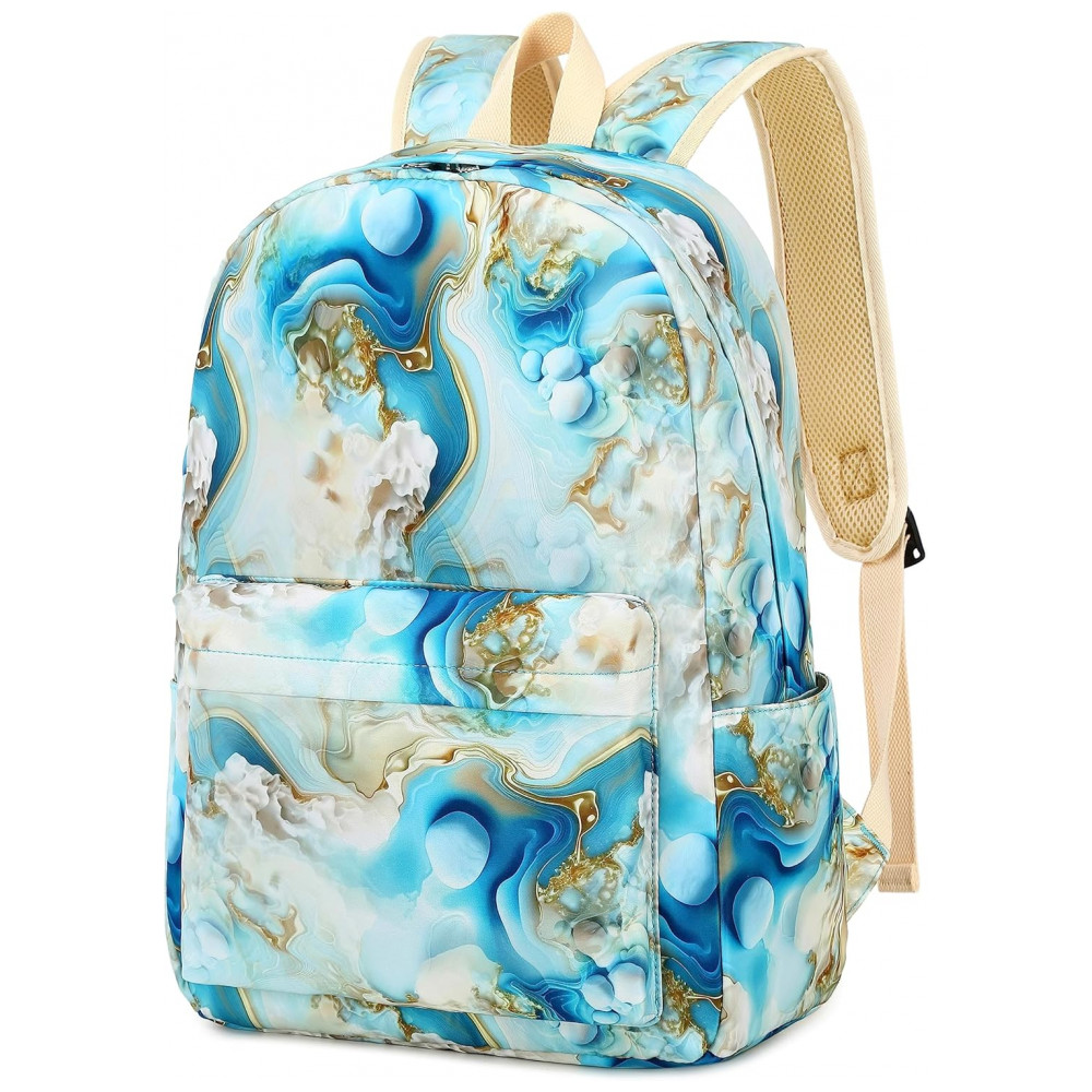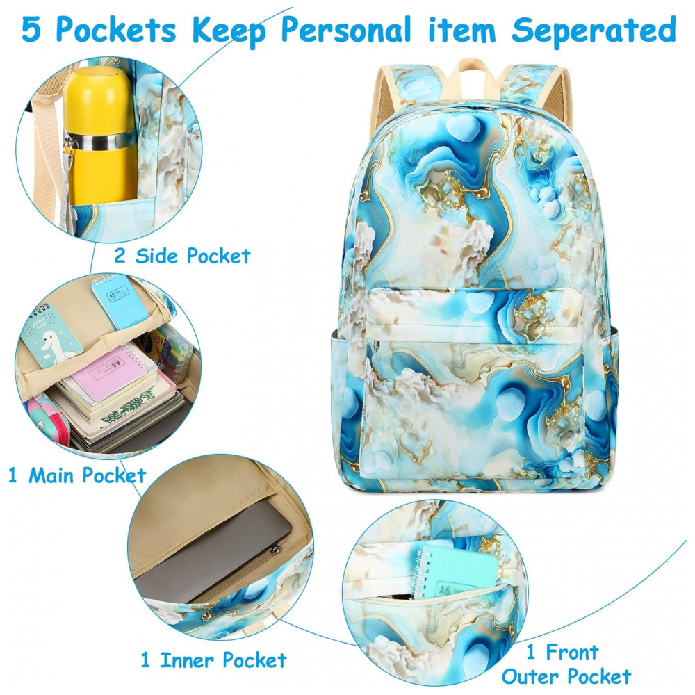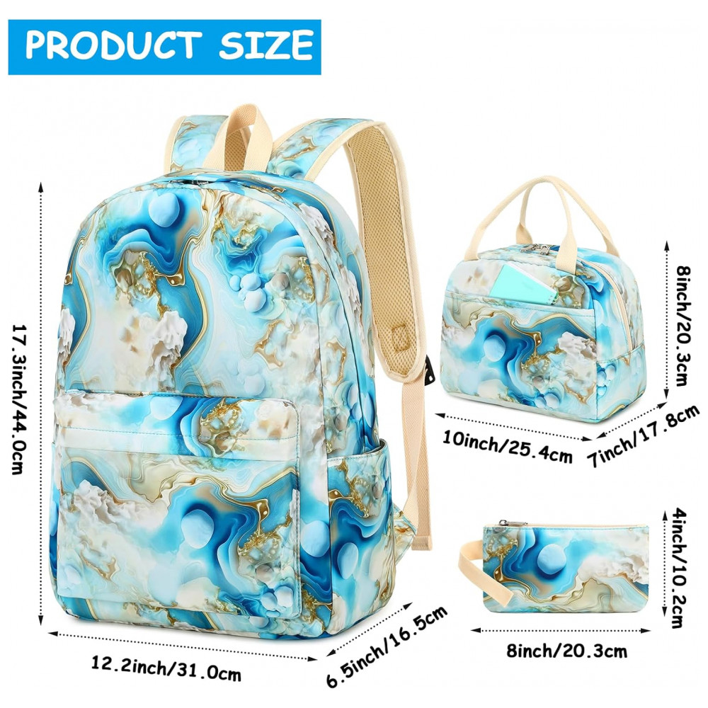 Mochila escolar Bluboon juvenil feminina azul e branco marmorizado conjunto 3 peças com bolsa lateral e estojo para notebook 355 cm