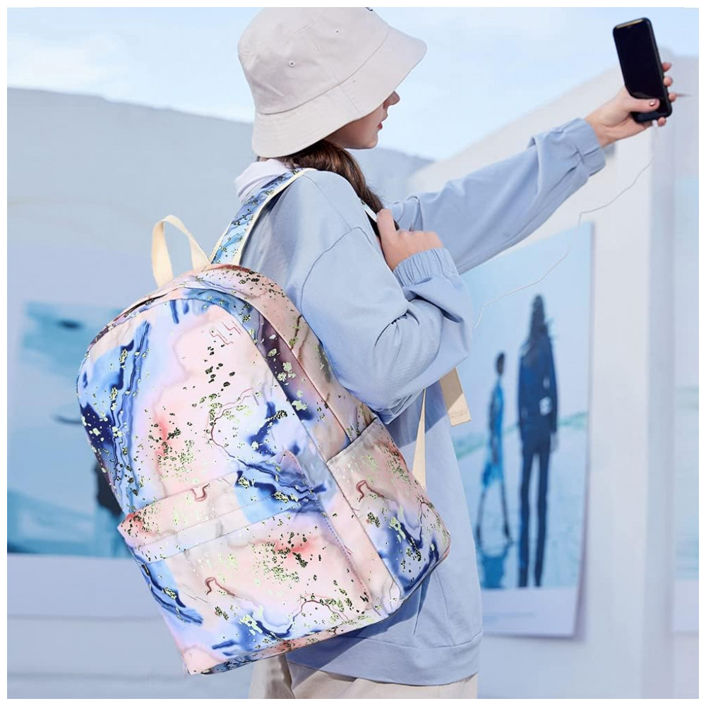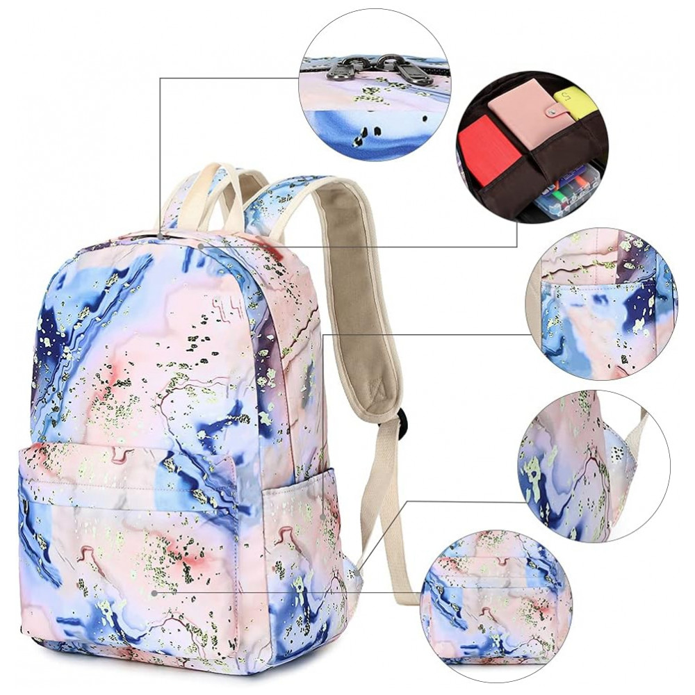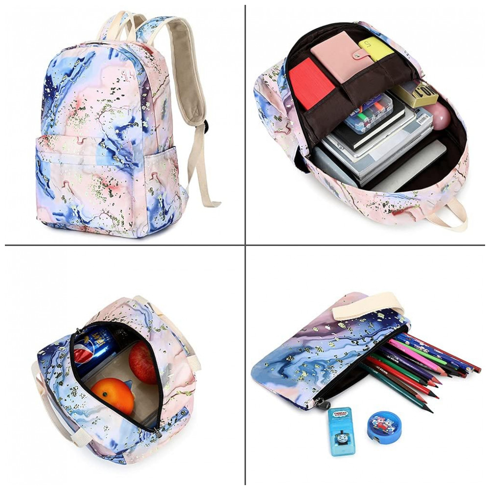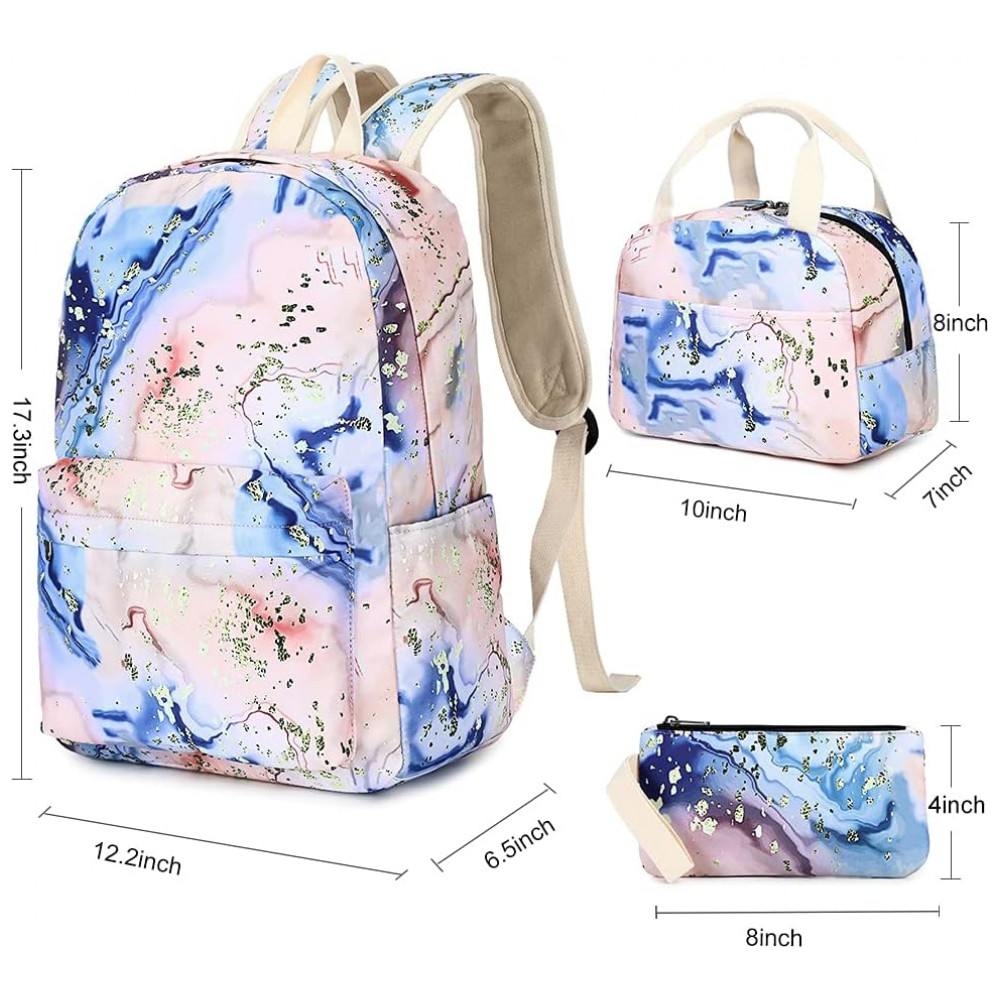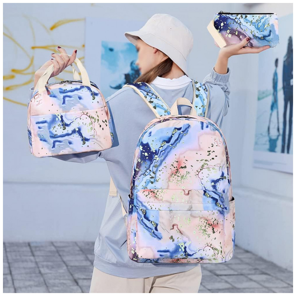 Conjunto escolar Bluboon 3 em 1 composto por mochila, lancheira térmica e estojo, indicado para meninas e adolescentes em rotina escolar, viagens e uso diário. A mochila possui compartimento interno acolchoado compatível com notebook de até 35,5 cm, espaço para fichários, cadernos, livros e demais materiais escolares, além de bolso frontal com zíper e bolsos laterais para garrafas ou pequenos objetos.