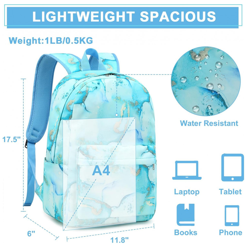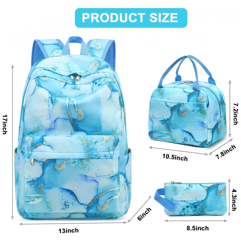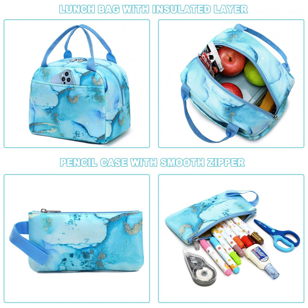 Mochila escolar Bluboon juvenil feminina mármore azul com dourado conjunto 3 peças com lancheira térmica e estojo para notebook 355 cm