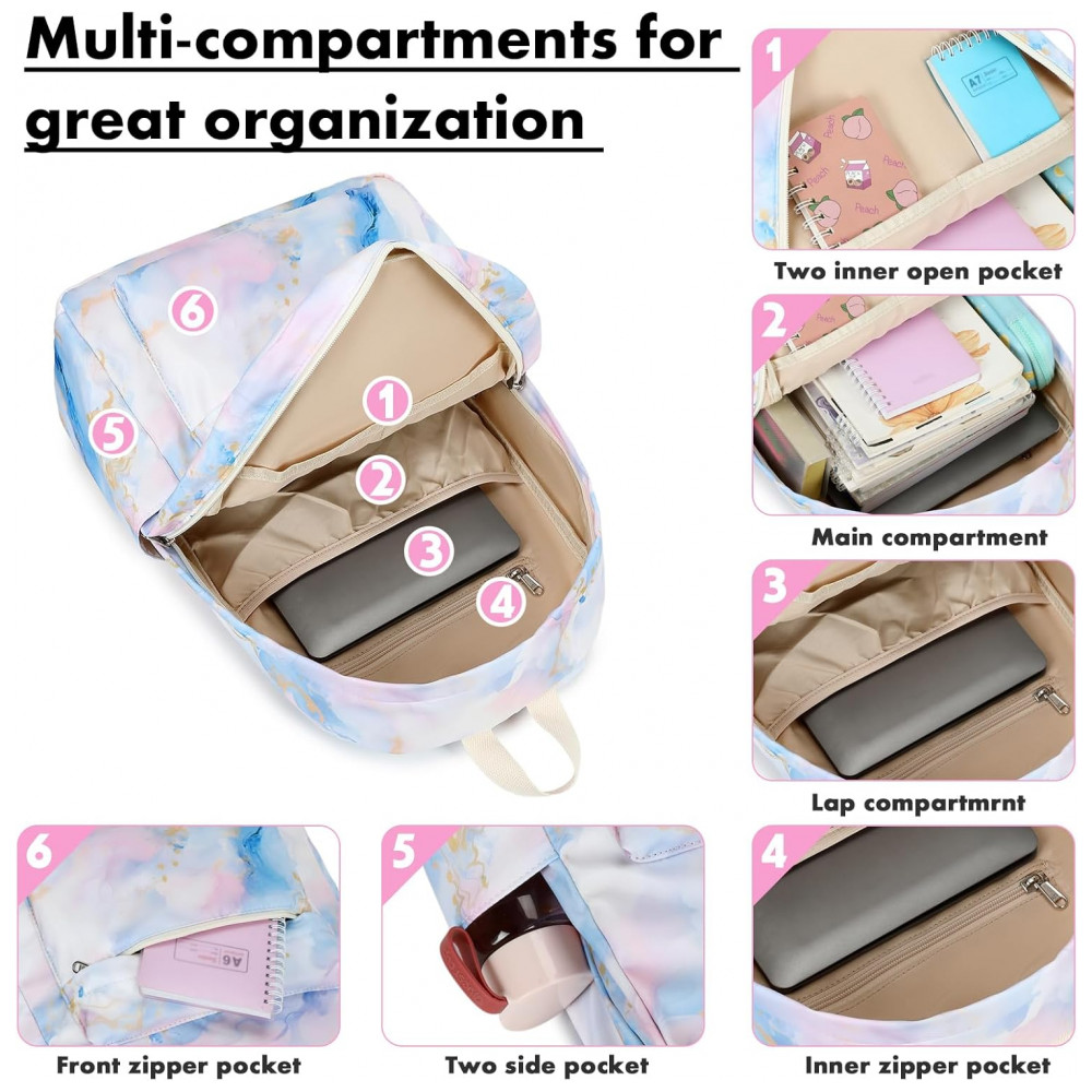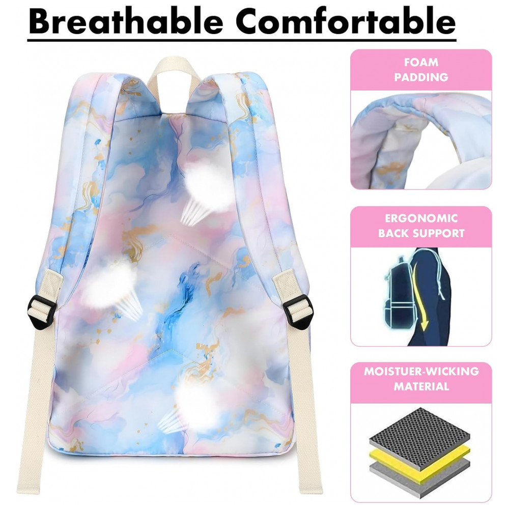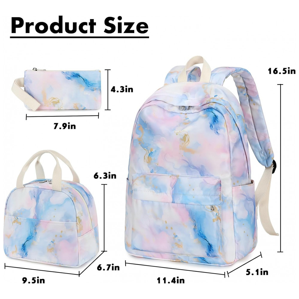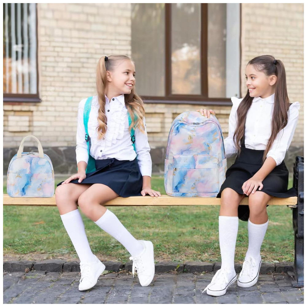 Mochila escolar Bluboon juvenil feminina mármore rosa azul roxo conjunto 3 peças com lancheira térmica e estojo para notebook 355 cm