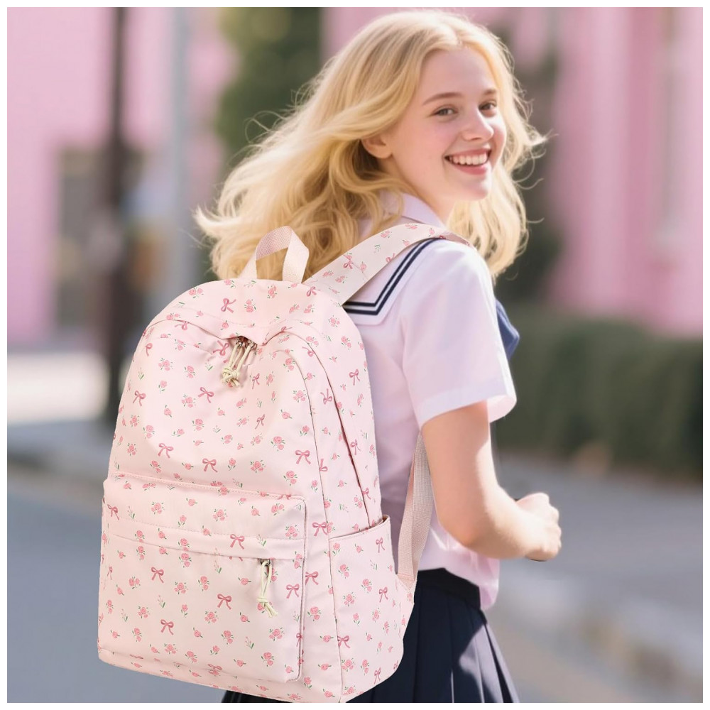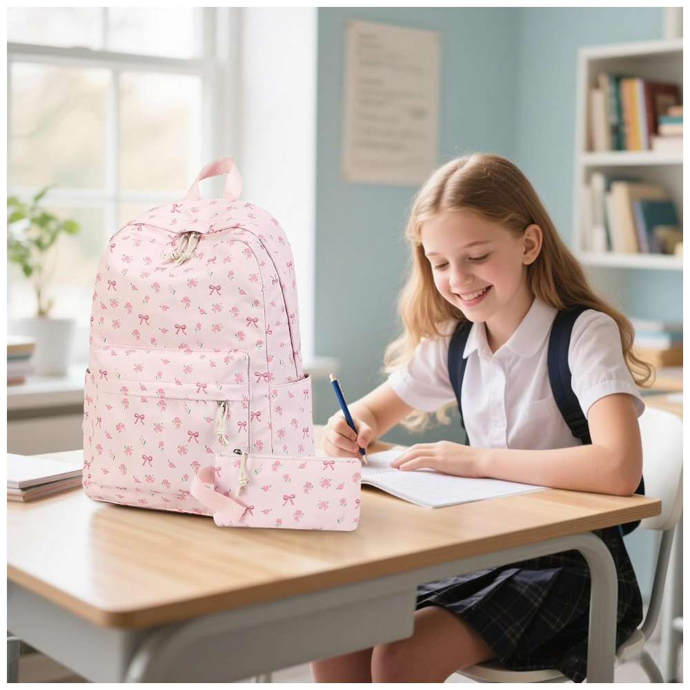 Mochila escolar Bluboon juvenil feminina rosa com laço conjunto 3 peças com lancheira térmica e estojo para notebook 355 cm