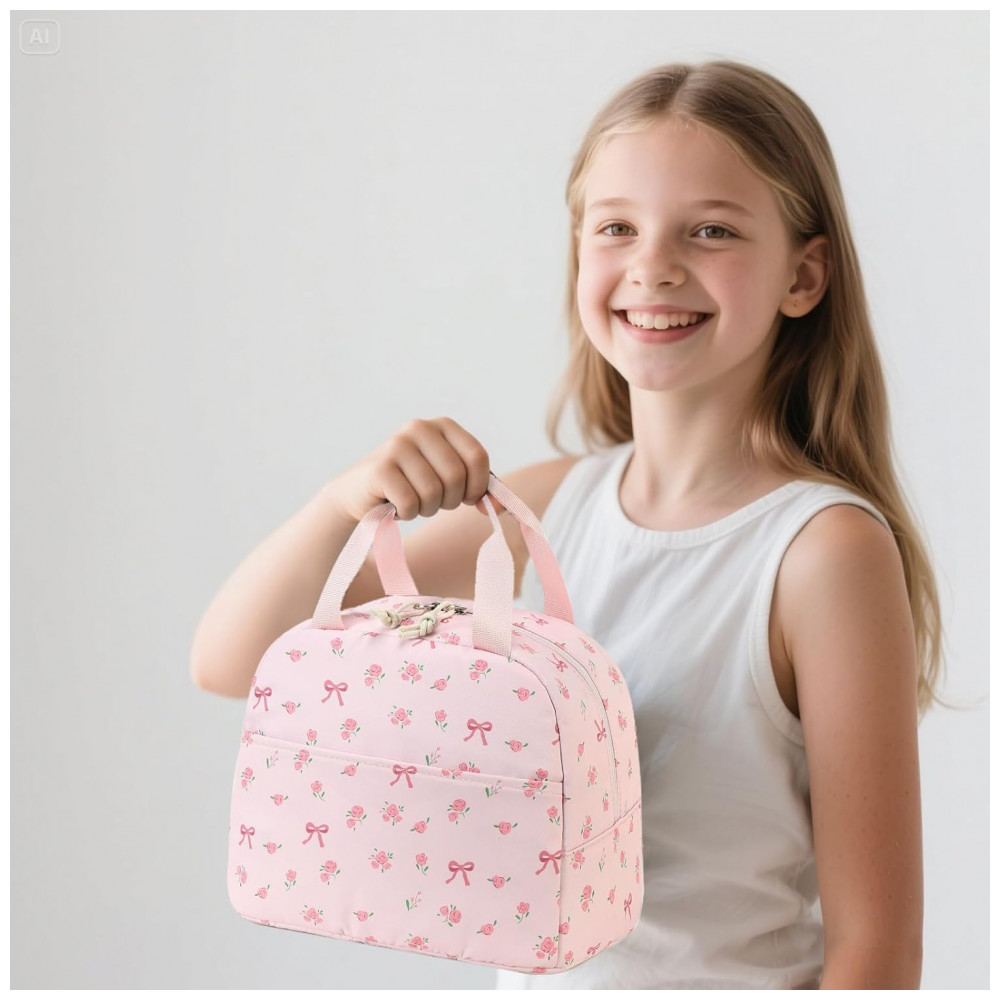 O tecido é macio, resistente e projetado para não rasgar com o uso frequente, enquanto as alças de ombro acolchoadas e ajustáveis ajudam a reduzir a pressão nos ombros. A lancheira térmica, com dimensões adequadas para marmitas, frutas e bebidas, possui interior isolado para manter os alimentos em boas condições, e o estojo acompanha o conjunto para organização de lápis, canetas e acessórios, mantendo visual coordenado em rosa com laço decorativo.
