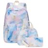 Conjunto escolar Bluboon 3 em 1 composto por mochila, lancheira térmica e estojo, indicado para meninas e adolescentes em rotina escolar, passeios e viagens. A mochila possui compartimento interno acolchoado compatível com notebook de até 35,5 cm, espaço para fichários, cadernos, livros e demais materiais escolares, além de bolso frontal com zíper e bolsos laterais para garrafas ou pequenos objetos.
