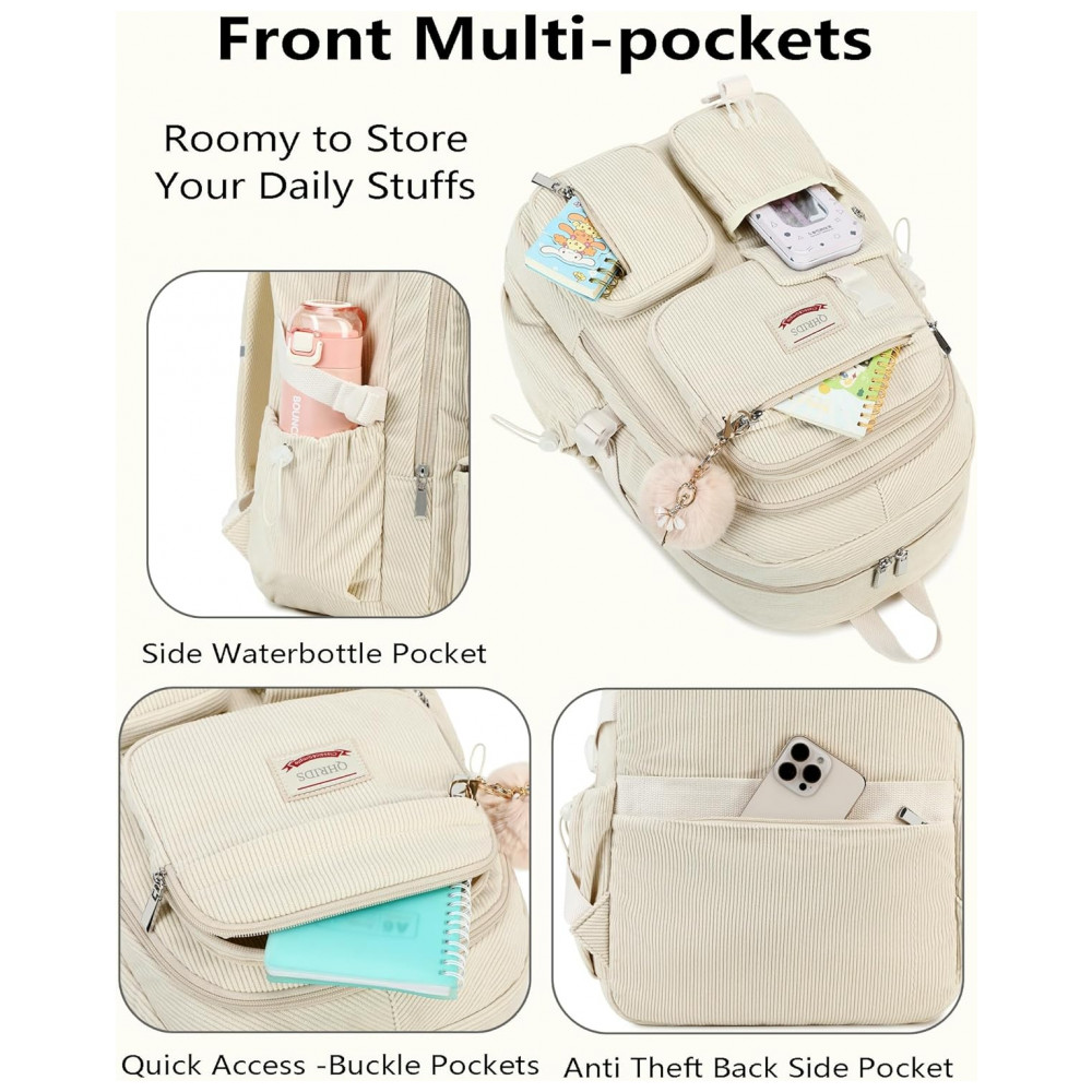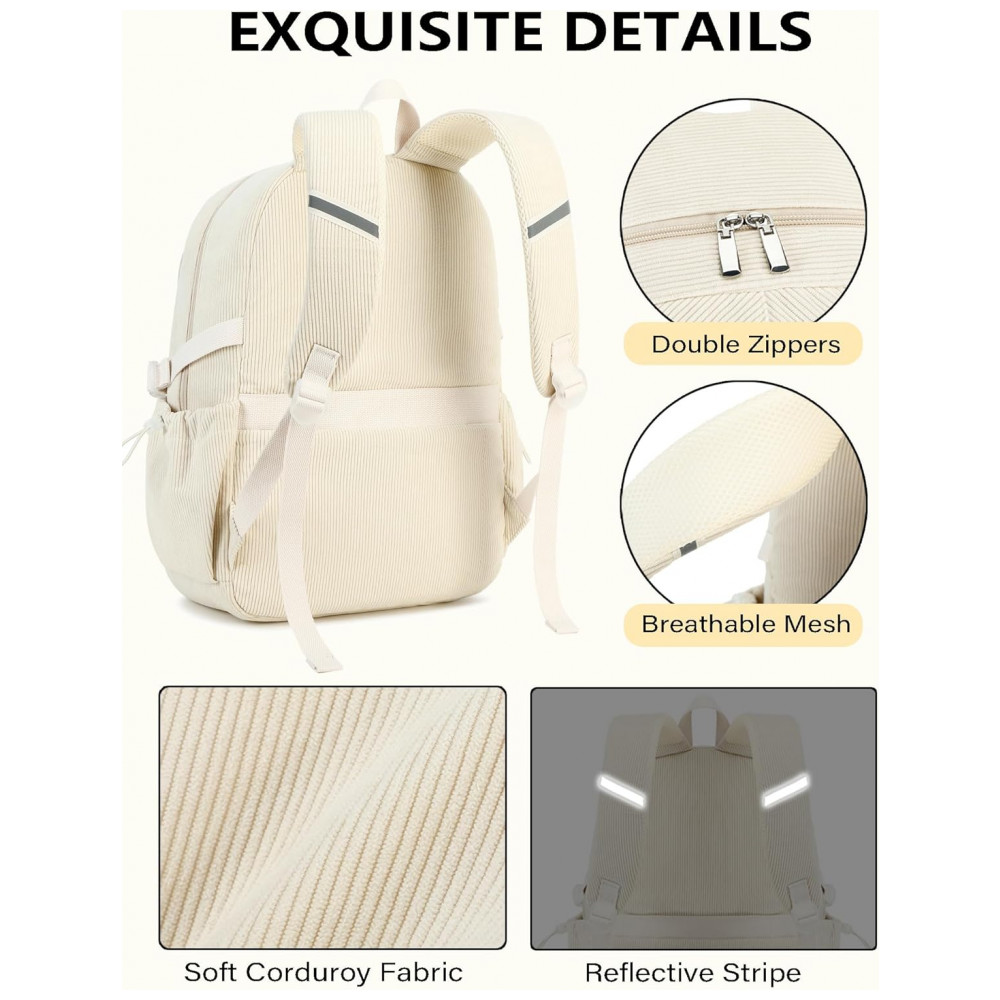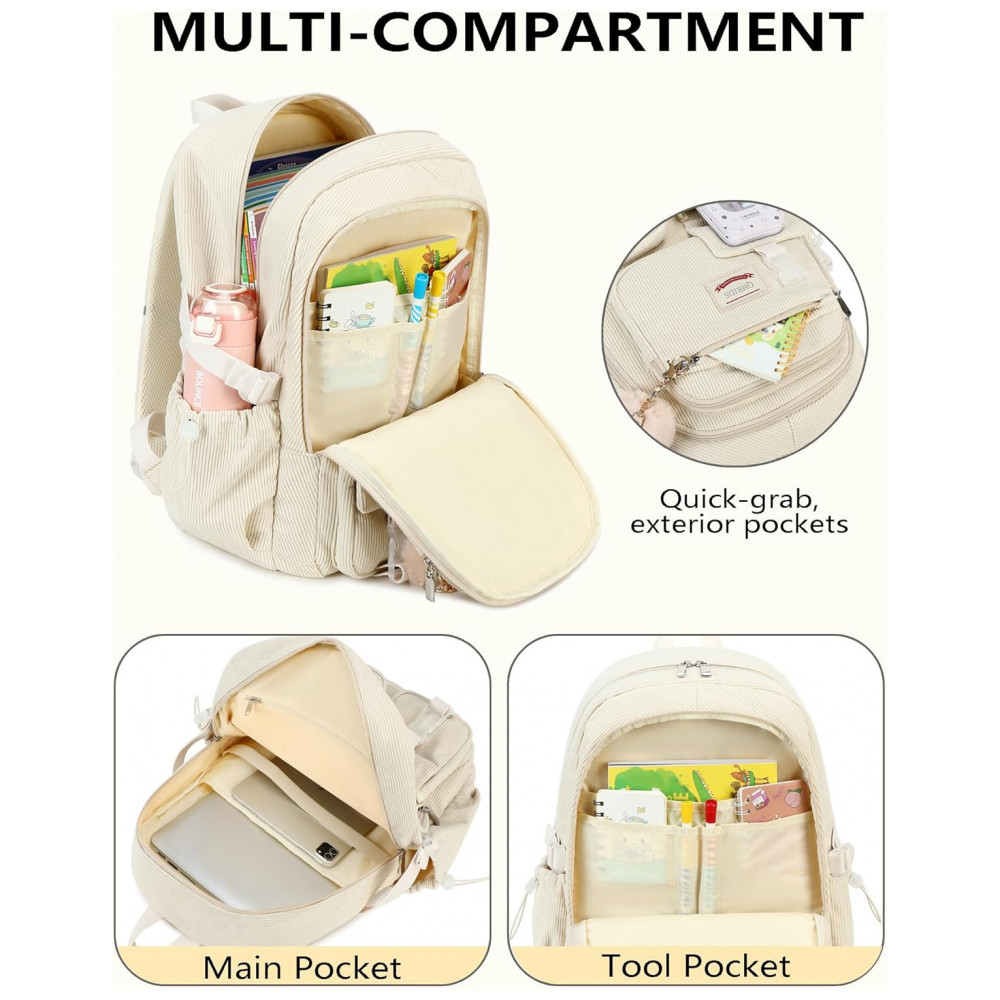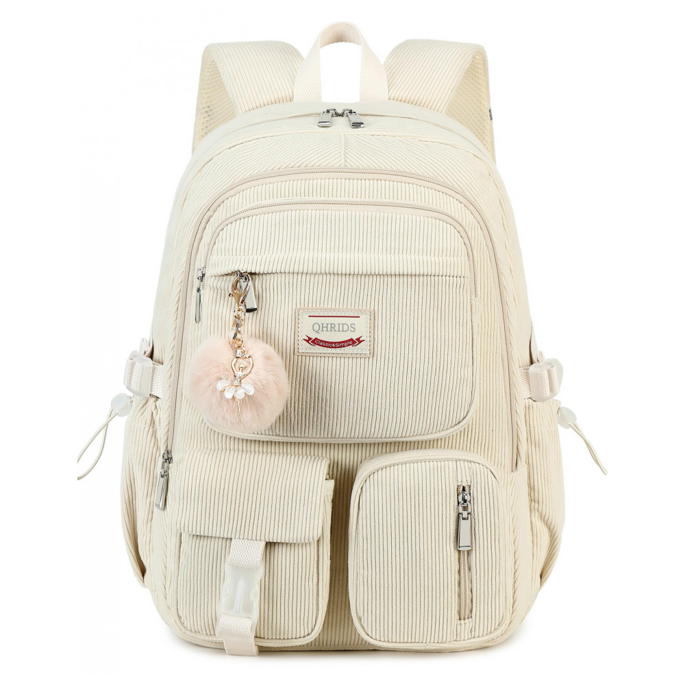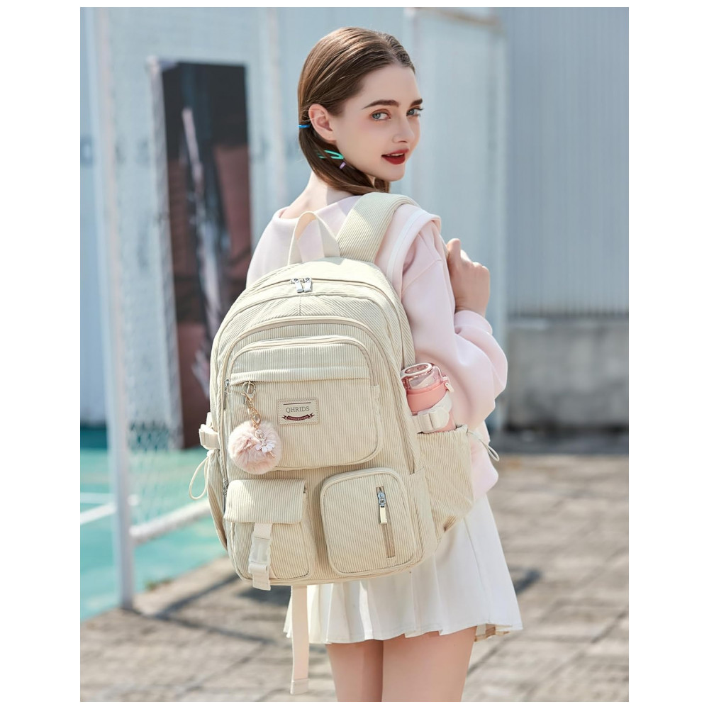 Mochila escolar de veludo cotelê QHRIDS bege para notebook 156″ múltiplos bolsos alça para mala