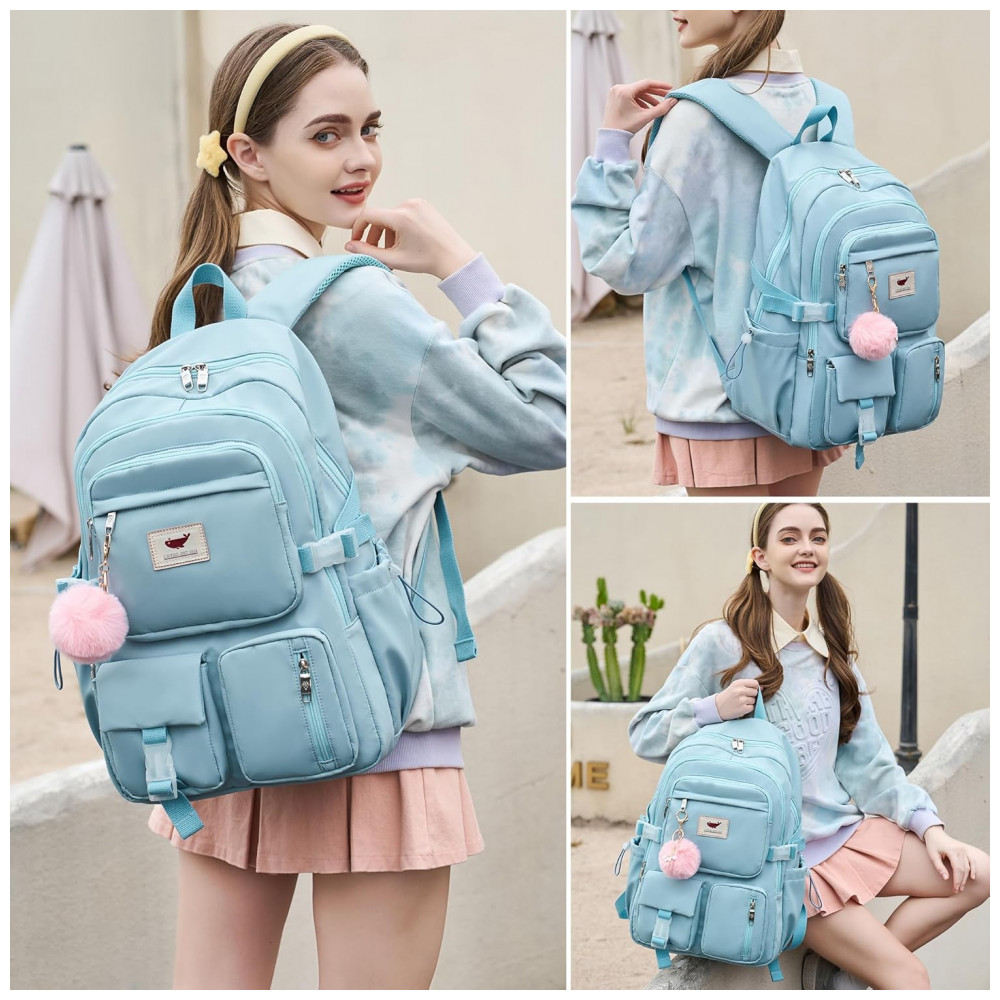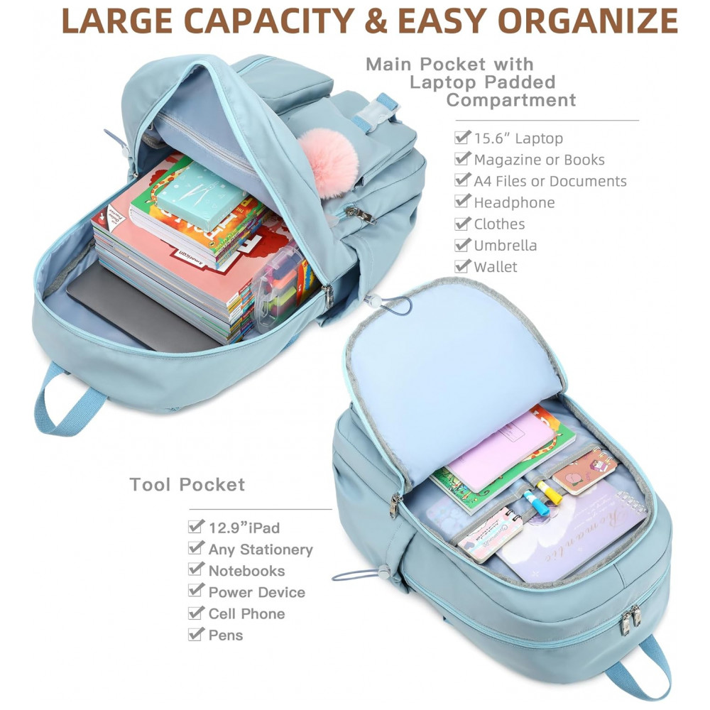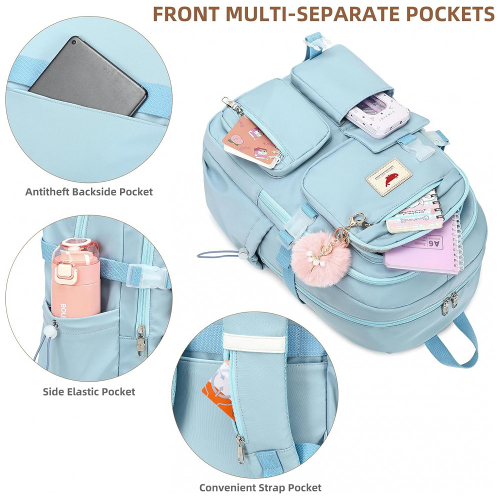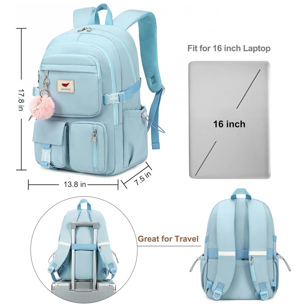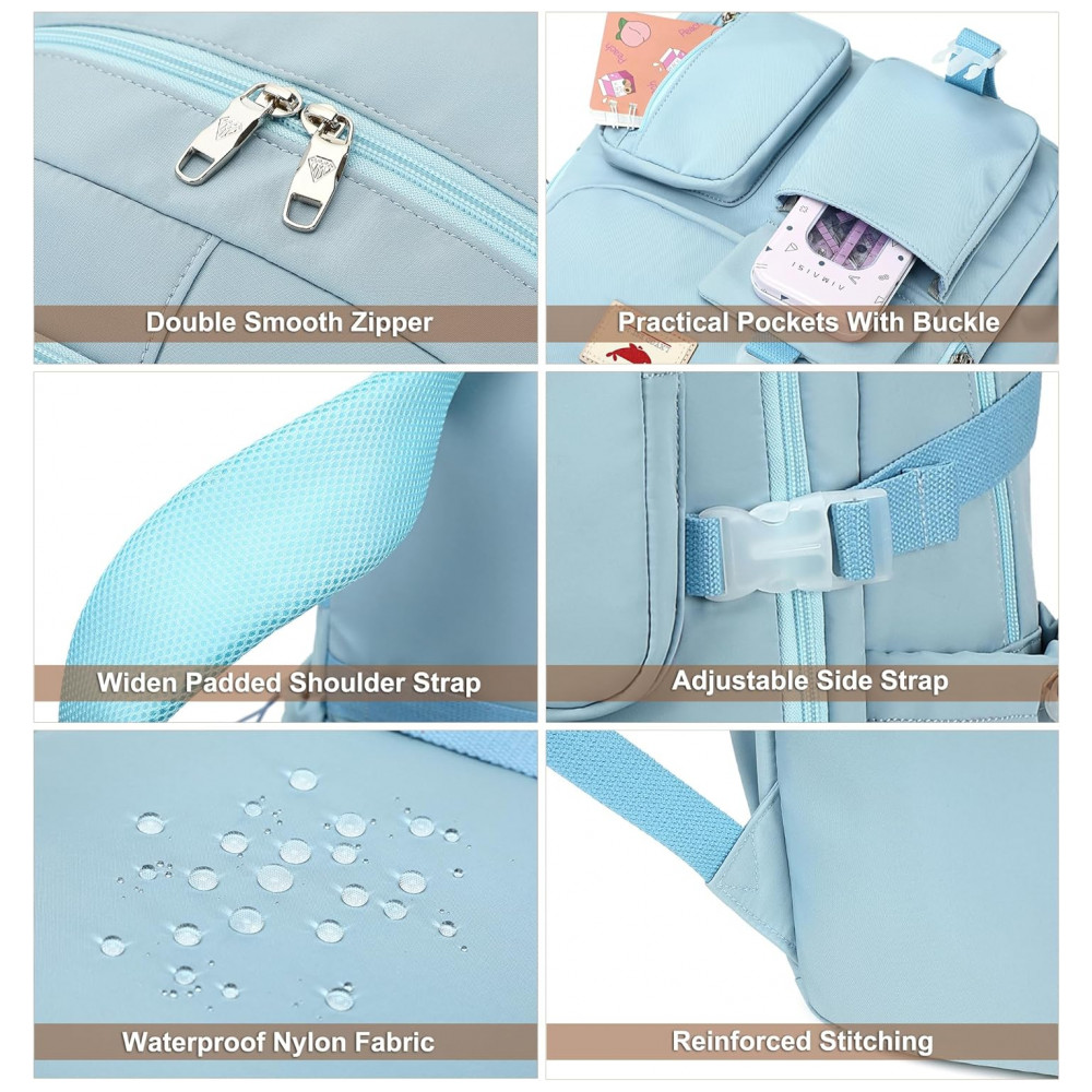 A mochila escolar feminina azul em nylon impermeável foi desenvolvida para uso diário em escola, faculdade e viagens curtas, com compartimento acolchoado para notebook de até 40 cm e múltiplos bolsos organizadores. O conjunto inclui mochila, lancheira e estojo, oferecendo solução completa para transporte de materiais, alimentação e itens de escrita em um kit leve e funcional.