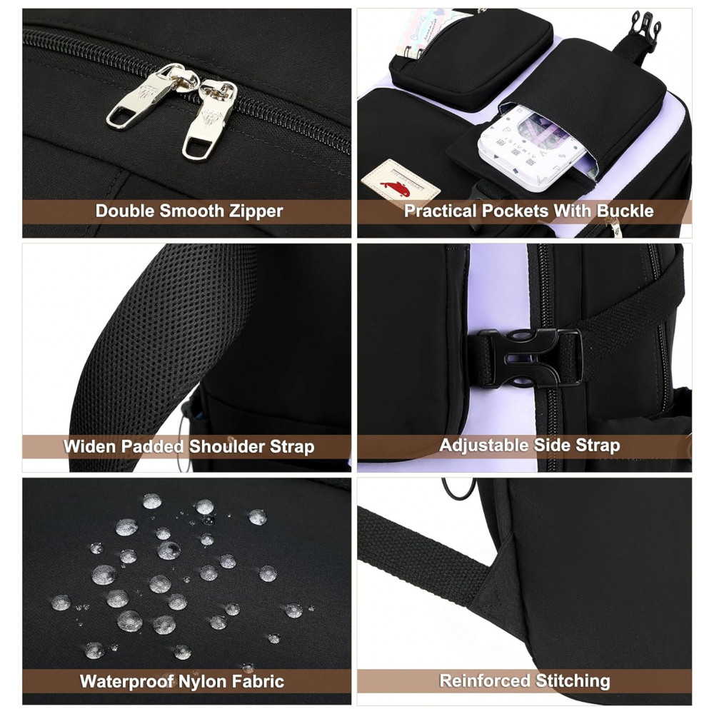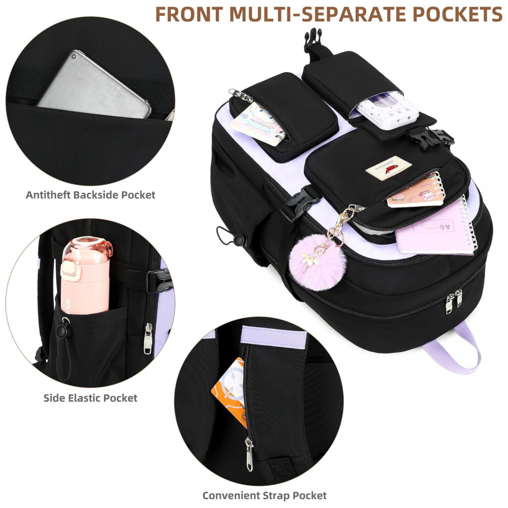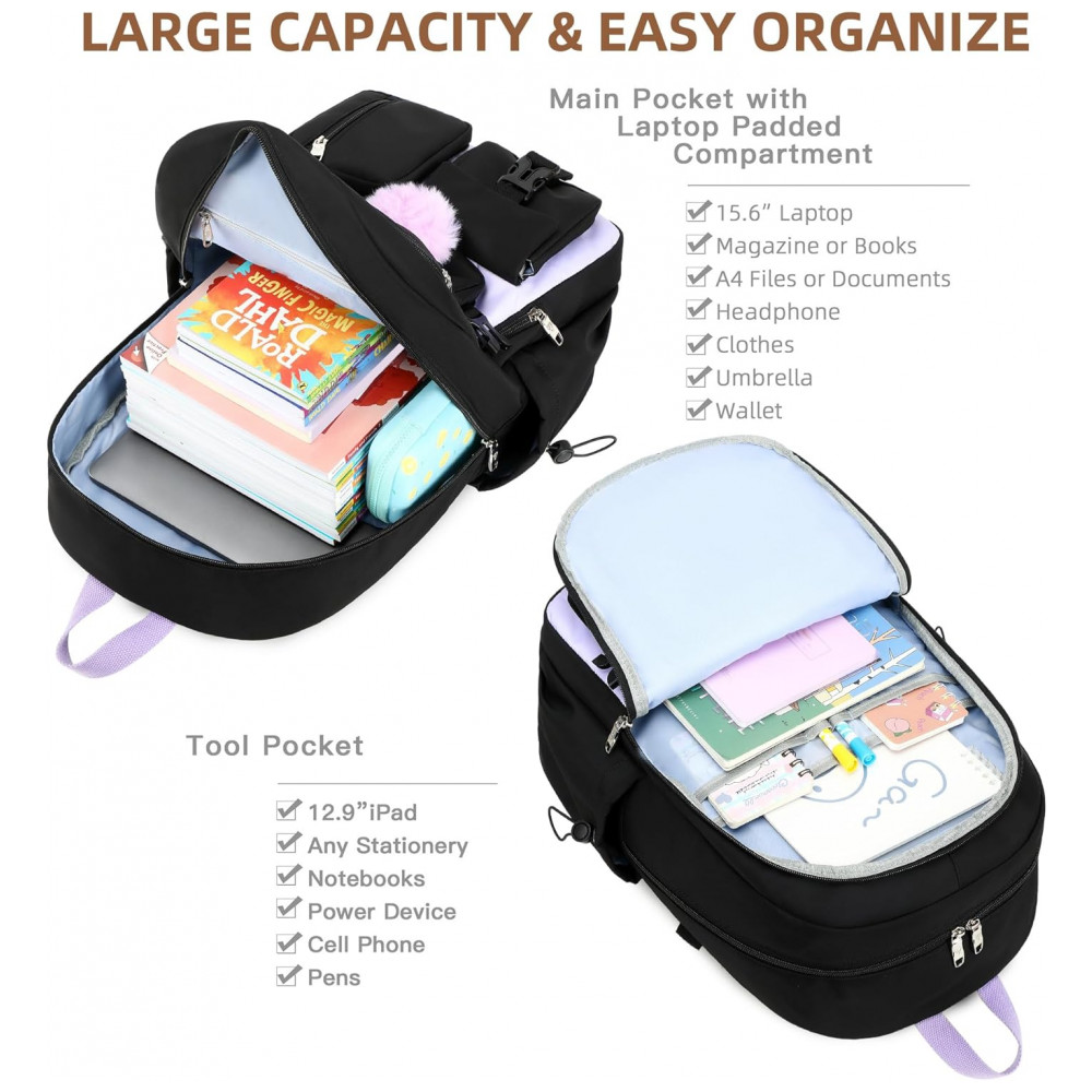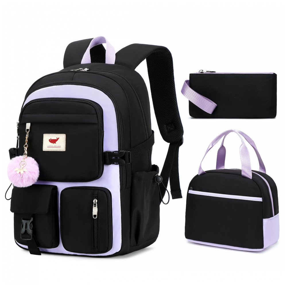 A mochila escolar feminina preta e roxa em nylon impermeável foi desenvolvida para uso diário em escola, faculdade e viagens curtas, com compartimento acolchoado para notebook de até 40 cm e múltiplos bolsos organizadores. O conjunto inclui mochila, lancheira e estojo, oferecendo solução completa para transporte de materiais, alimentação e itens de escrita em um kit leve e funcional.