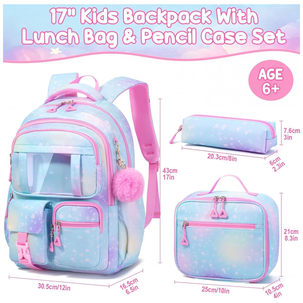 Conjunto escolar 3 em 1 composto por mochila, lancheira térmica e estojo, em tom azul com detalhes em formato de corações, indicado para meninas a partir de 6 anos no ensino fundamental e médio. A mochila mede aproximadamente 43 cm de altura, 30 cm de largura e 17 cm de profundidade, com seis compartimentos de tamanhos diferentes e dois bolsos laterais, permitindo acomodar notebook de até 15,6″, livros, cadernos, pastas em formato A4 e demais materiais escolares, além de três bolsos frontais para acesso rápido e bolso transparente para visualização imediata de pequenos itens.