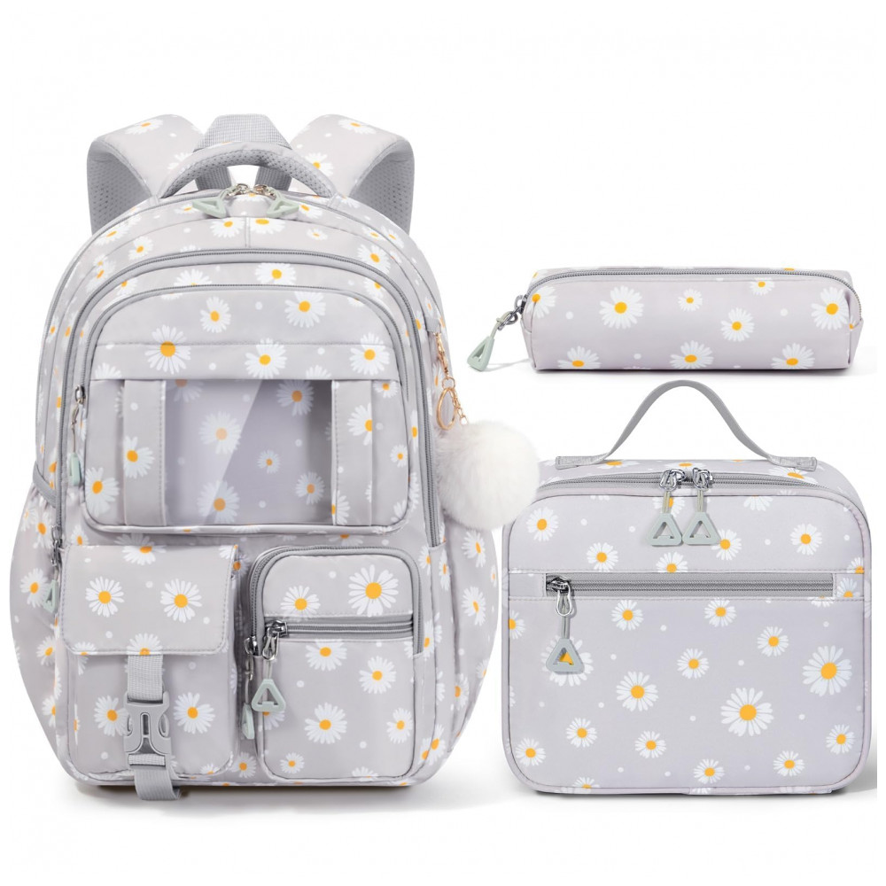 Mochila escolar Fimibuke cinza com estampa de margaridas 3 em 1 lancheira térmica e estojo