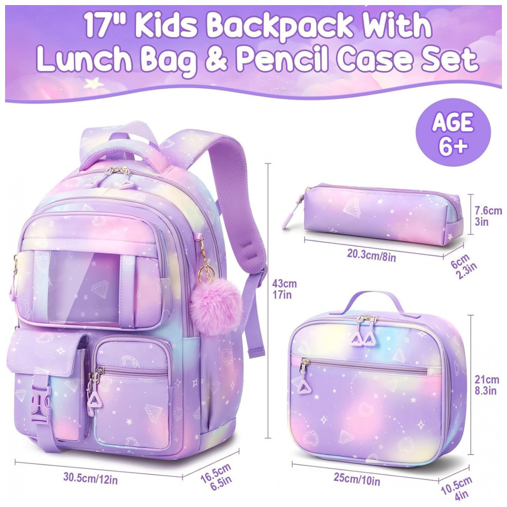 O conjunto é confeccionado em poliéster leve, resistente e repelente à água, com costuras reforçadas e zíperes de abertura suave, adequado ao uso diário em ambiente escolar e atividades externas. As alças de ombro da mochila são acolchoadas com espuma espessa, possuem desenho ergonômico e fivela peitoral para melhor distribuição do peso e redução de deslizamentos, enquanto o painel traseiro acolchoado com material respirável aumenta o conforto. A lancheira com isolamento térmico de parede dupla mantém alimentos e bebidas em temperatura adequada, e o estojo com bom volume interno organiza lápis, canetas e outros acessórios.
