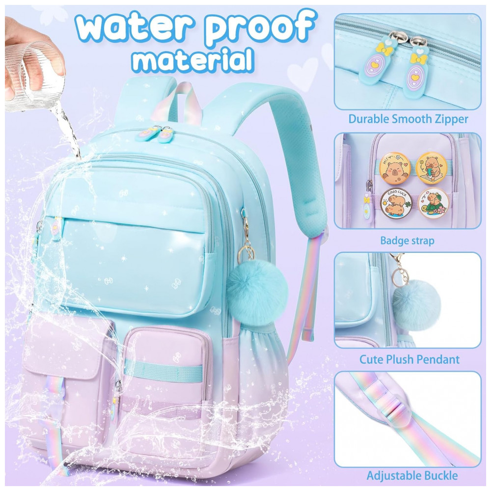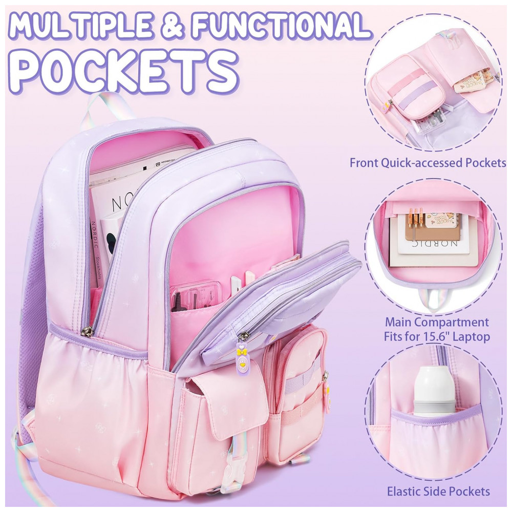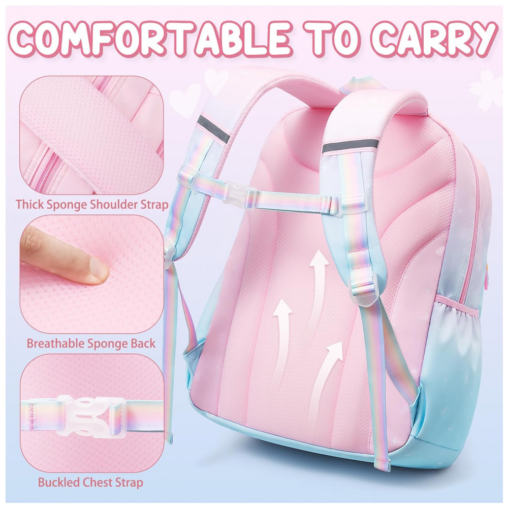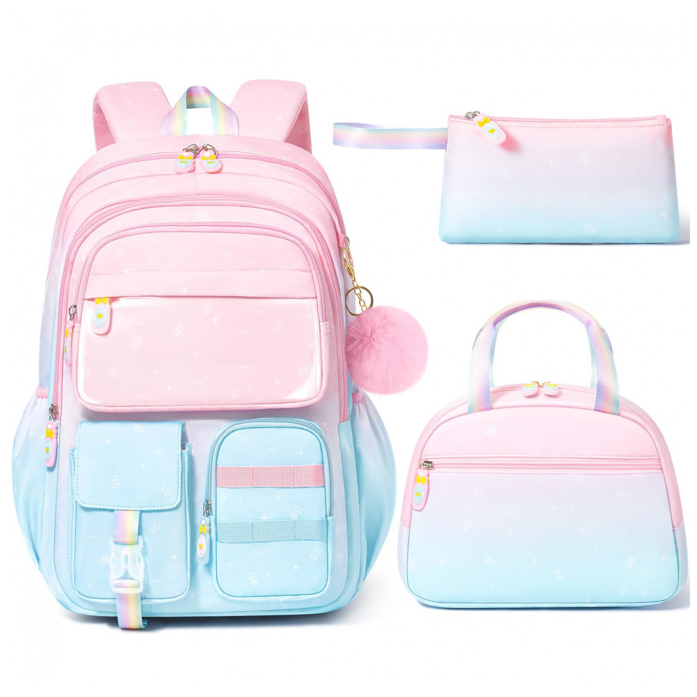 Conjunto escolar 3 em 1 composto por mochila em degradê de cores, lancheira térmica e estojo, indicado para crianças e adolescentes em idade pré-escolar, ensino fundamental e médio. A mochila possui compartimento principal com sleeve acolchoado para notebook ou tablet de até 15″, espaço para livros e cadernos, seções intermediárias com zíper para cadernos e estojos, bolso transparente para horários ou fotos, quatro bolsos frontais para lanches e pequenos objetos e dois bolsos laterais com elástico para garrafas e guarda-chuva.