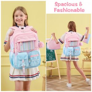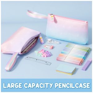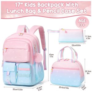 Conjunto escolar 3 em 1 composto por mochila em degradê de cores, lancheira térmica e estojo, indicado para crianças e adolescentes em idade pré-escolar, ensino fundamental e médio. A mochila possui compartimento principal com sleeve acolchoado para notebook ou tablet de até 15″, espaço para livros e cadernos, seções intermediárias com zíper para cadernos e estojos, bolso transparente para horários ou fotos, quatro bolsos frontais para lanches e pequenos objetos e dois bolsos laterais com elástico para garrafas e guarda-chuva.
