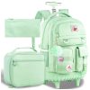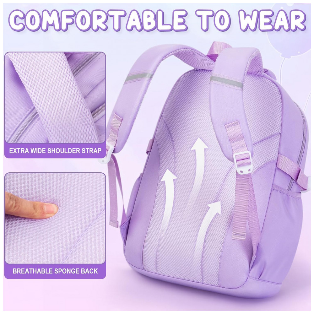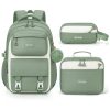 Mochila escolar Fimibuke em conjunto de 3 peças, composta por mochila, lancheira térmica e estojo, indicada para estudantes de 6 anos em diante no ensino fundamental, médio e atividades de lazer. A mochila oferece grande capacidade interna com compartimento para notebook de até 39,6 cm, divisórias para livros e cadernos, bolso intermediário para cadernos e dois bolsos frontais e laterais para itens de acesso rápido como garrafas e guarda-chuva.