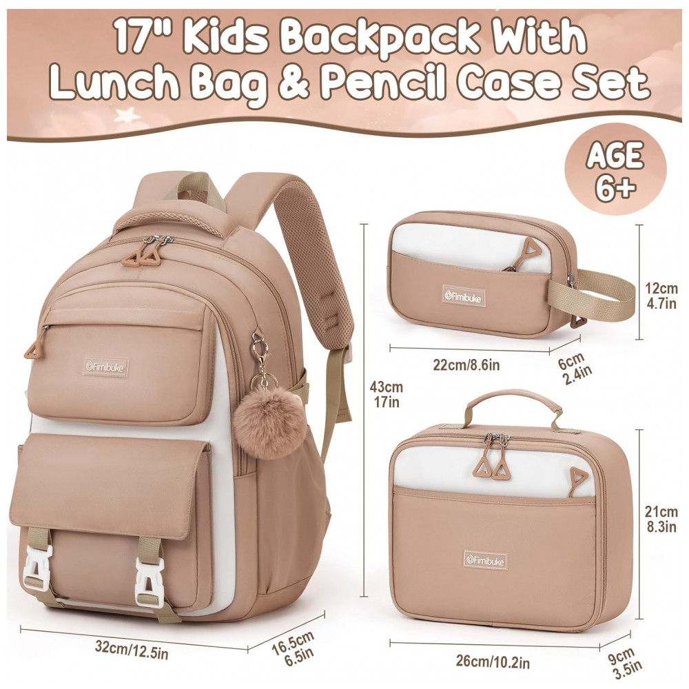 Mochila escolar Fimibuke em conjunto de 3 peças, composta por mochila, lancheira térmica e estojo, indicada para estudantes a partir de 6 anos no ensino fundamental, médio e em atividades de lazer. A mochila possui grande capacidade interna com compartimento acolchoado para notebook de até 39,6 cm, divisórias para livros e fichários, bolso intermediário com zíper para cadernos, dois bolsos frontais para itens de acesso rápido e dois bolsos laterais para garrafas e guarda-chuva.