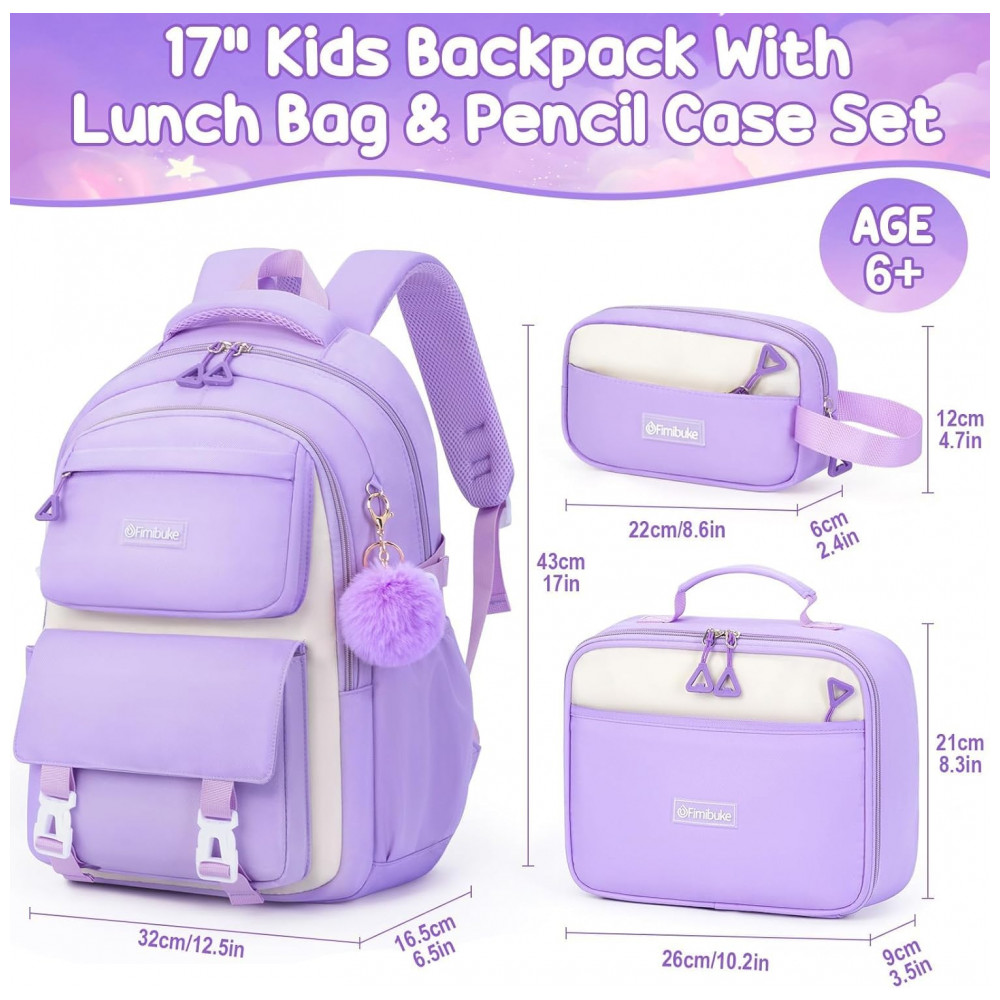 Mochila escolar Fimibuke em conjunto de 3 peças, composta por mochila, lancheira térmica e estojo, indicada para estudantes a partir de 6 anos no ensino fundamental, médio e em atividades de lazer. A mochila possui grande capacidade interna com compartimento acolchoado para notebook de até 39,6 cm, divisórias para livros e fichários, bolso intermediário com zíper para cadernos, dois bolsos frontais para itens de acesso rápido e dois bolsos laterais para garrafas e guarda-chuva.