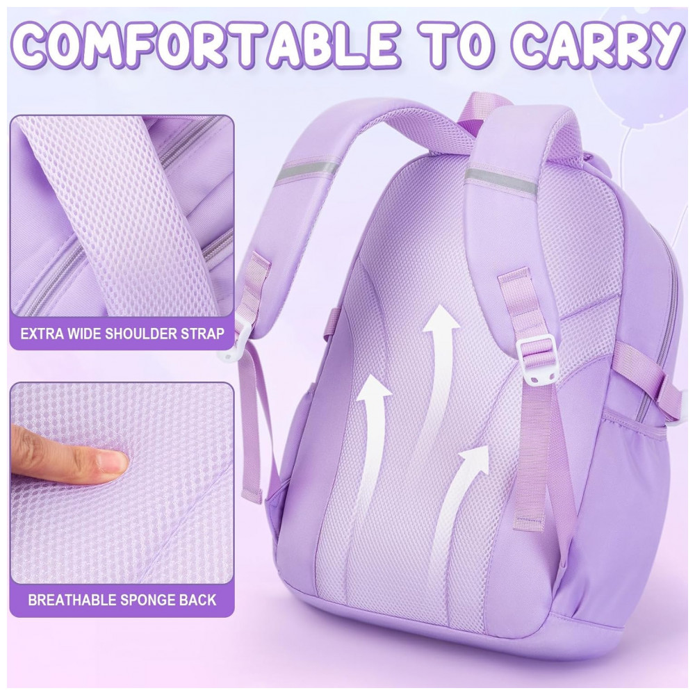 O conjunto é produzido em poliéster leve, impermeável, de fácil limpeza e livre de BPA, com alças de ombro acolchoadas, ajustáveis e respiráveis, além de encosto com material respirável que auxilia na dissipação de calor e absorção do suor. A lancheira com isolamento em múltiplas camadas foi projetada para manter alimentos em temperatura adequada por várias horas, enquanto o estojo com dois compartimentos com zíper organiza lápis, canetas, marcadores e pequenos acessórios escolares, complementado por pingente em pelúcia macia no padrão roxo com bege.