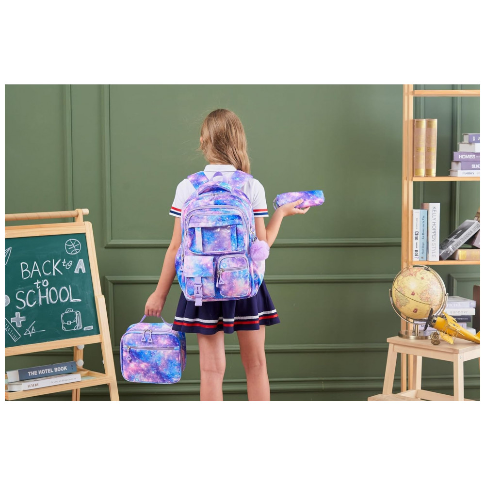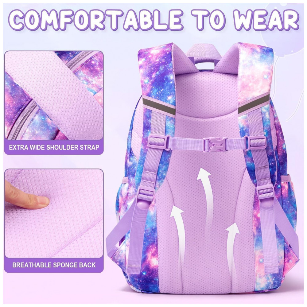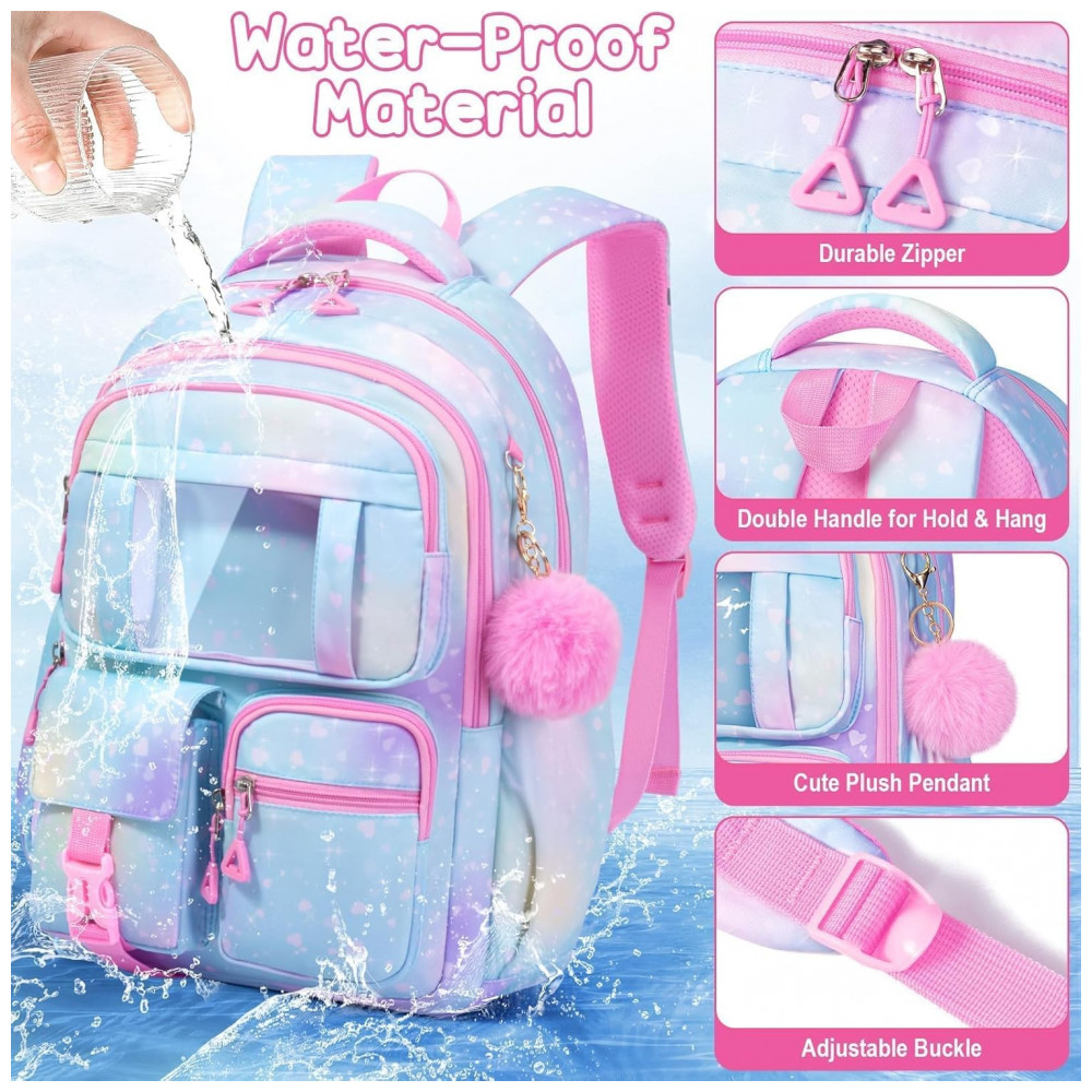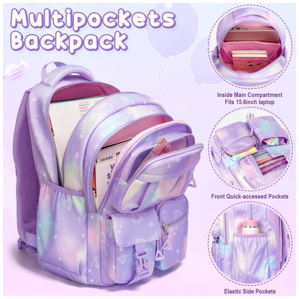 Conjunto escolar 3 em 1 composto por mochila, lancheira térmica e estojo, indicado para meninas a partir de 6 anos em fase de ensino fundamental e médio. A mochila mede aproximadamente 43 cm de altura, 30 cm de largura e 17 cm de profundidade, com compartimento principal capaz de acomodar notebook de até 15,6″, livros, cadernos, revistas e pastas em formato A4, além de três bolsos frontais externos para acesso rápido e um bolso transparente para visualização imediata de itens como cartões, bilhetes e pequenos objetos.