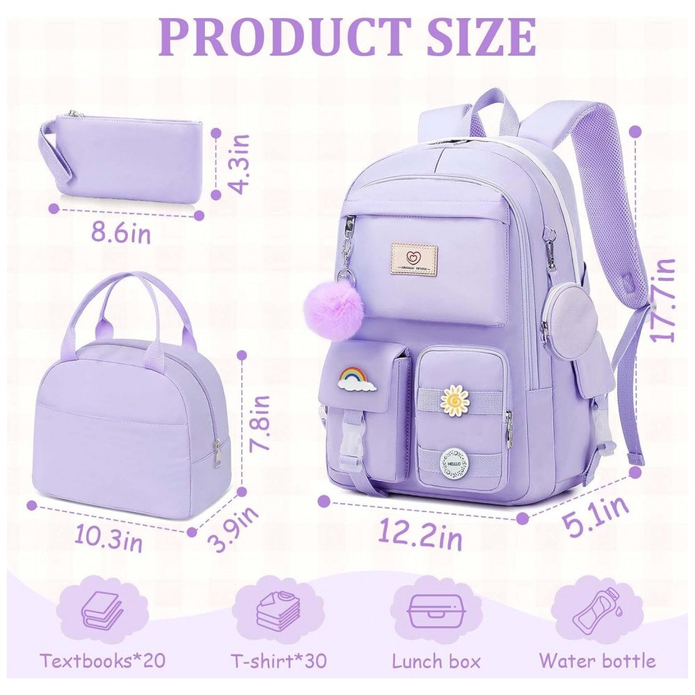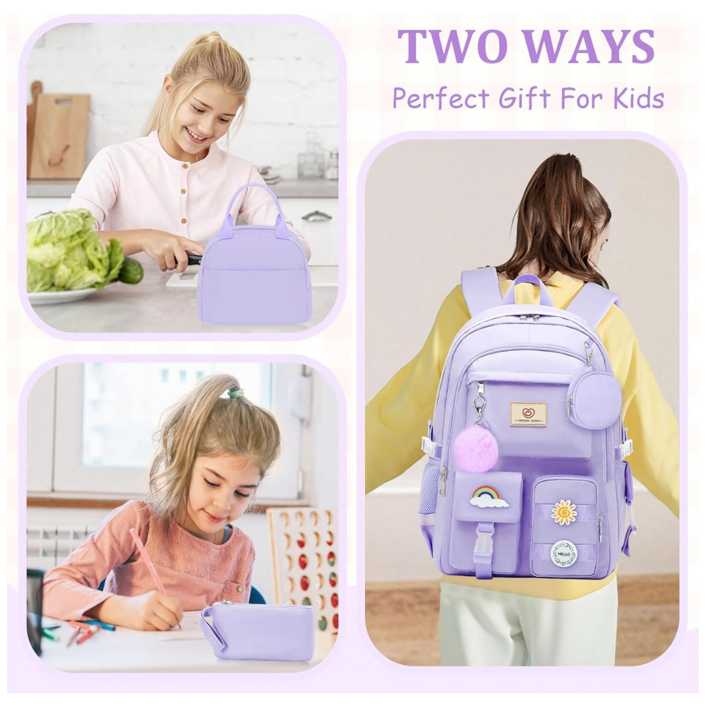 Mochila escolar Fitvc em conjunto de 6 peças, indicada para meninas, adolescentes e jovens em rotina escolar, viagens e uso diário. O design com múltiplos compartimentos acomoda livros, cadernos, materiais de escrita, garrafas e itens pessoais, enquanto lancheira térmica, estojo, bolsa de moeda removível, chaveiro com pompom e pins decorativos completam o kit de organização.