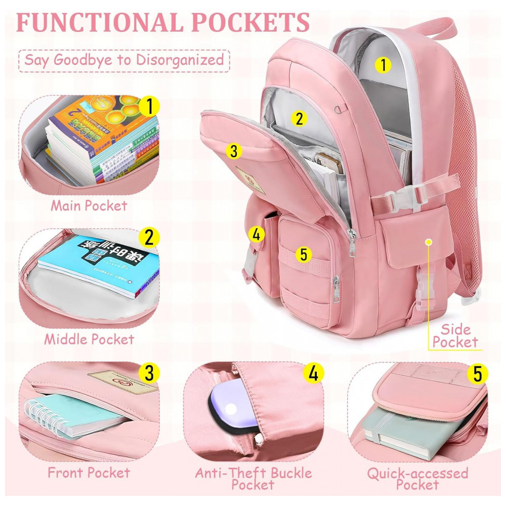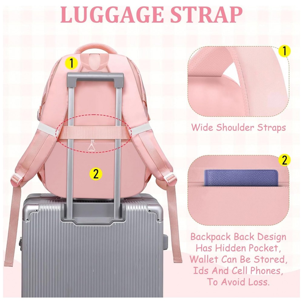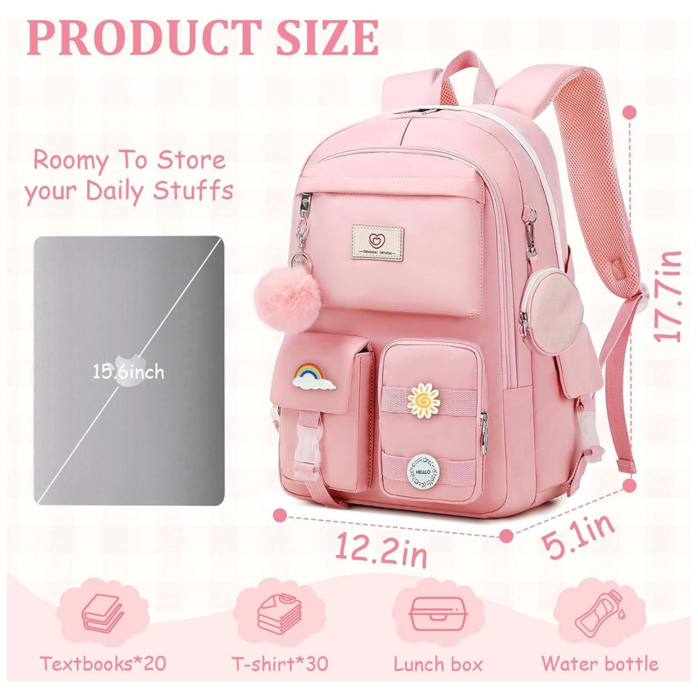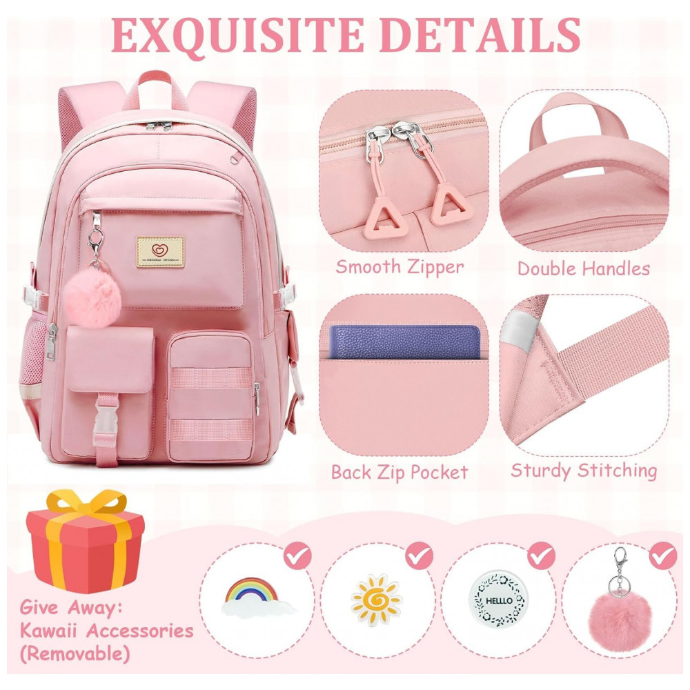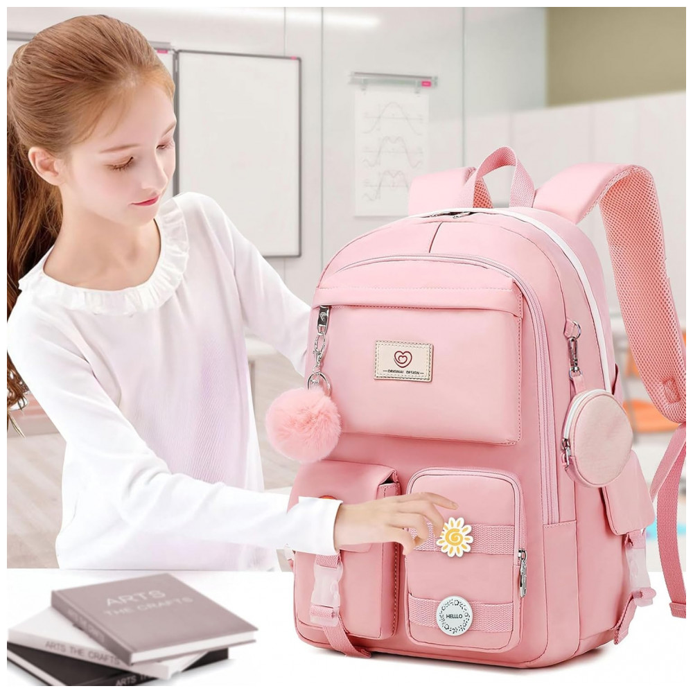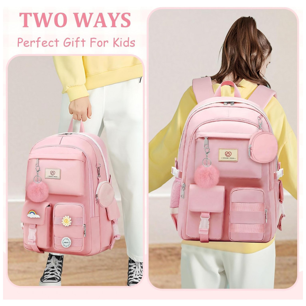 Mochila escolar Fitvc juvenil feminina nylon rosa grande capacidade multifuncional com bolsa de moeda e pins decorativos