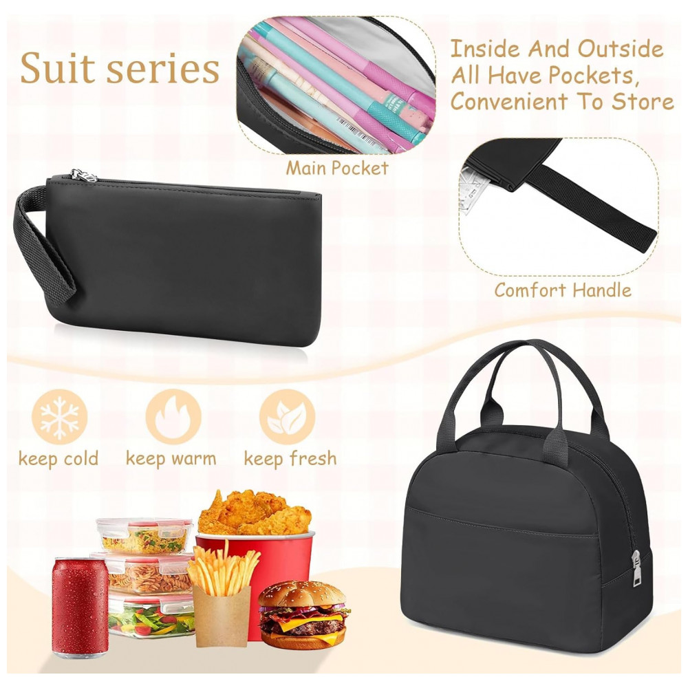 Conjunto escolar Fitvc com 6 peças, formado por mochila, lancheira, estojo, bolsa de moeda removível, chaveiro com pompom e três pins decorativos, desenvolvido para meninas, adolescentes e jovens em rotina escolar e viagens. A mochila possui grande capacidade interna e múltiplos compartimentos, permitindo organizar livros, cadernos, materiais de escrita, acessórios e itens pessoais de forma prática ao longo do dia.
