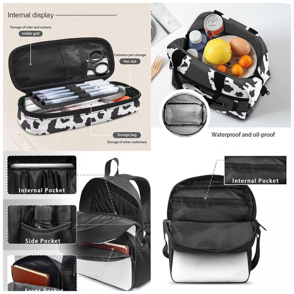 Conjunto escolar com quatro peças composto por mochila de aproximadamente 43 cm de altura (17″), lancheira, bolsa tiracolo compacta e estojo, indicado para crianças a partir de 7 anos, adolescentes e adultos em rotinas escolares e de lazer. A mochila principal em poliéster leve e resistente a arranhões conta com compartimento interno com bolso para caderno ou dispositivo, bolso frontal para itens de acesso rápido, bolsos laterais para garrafa de água e guarda-chuva, além de fechamento em zíper de curso suave.