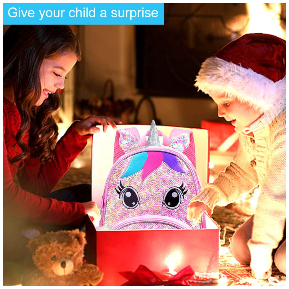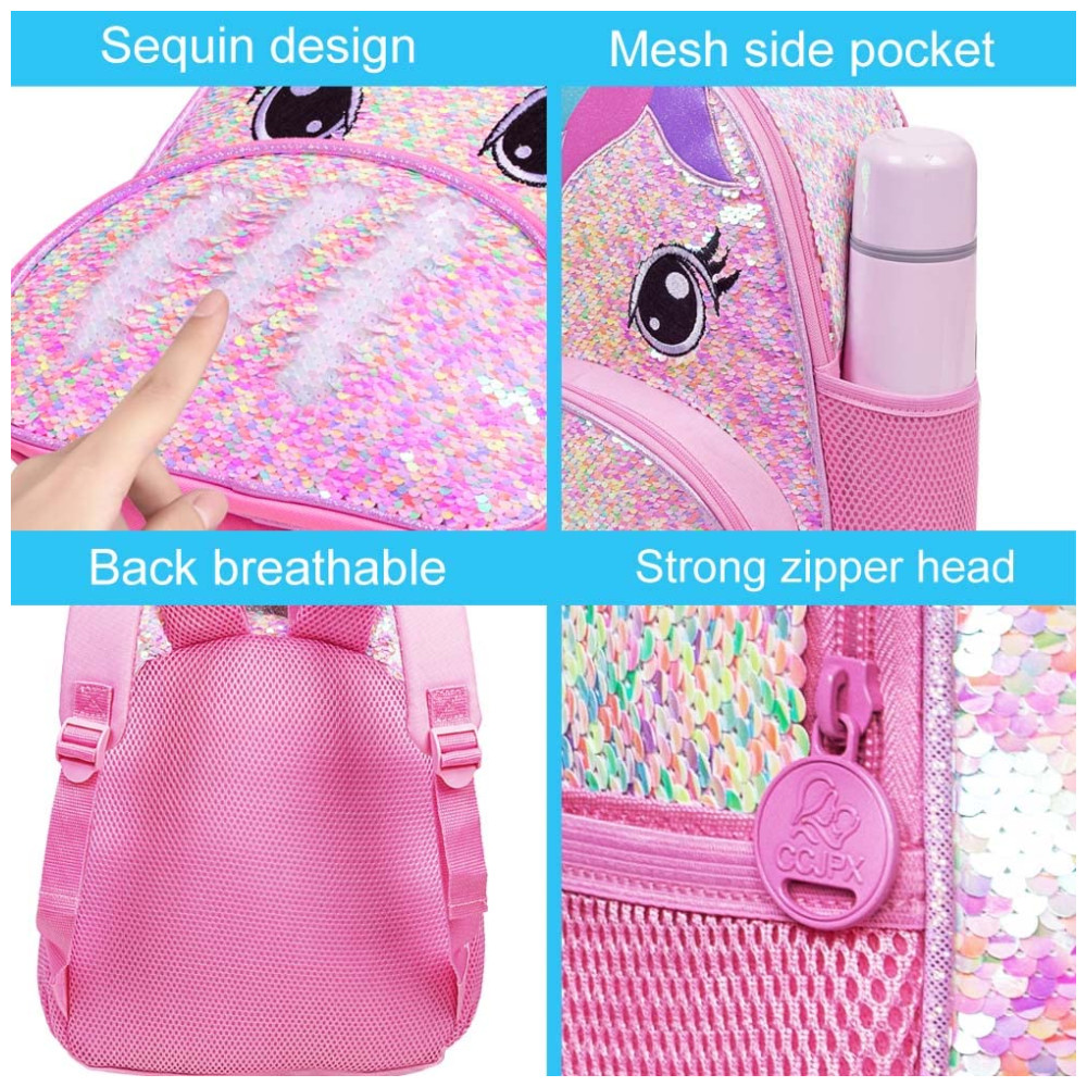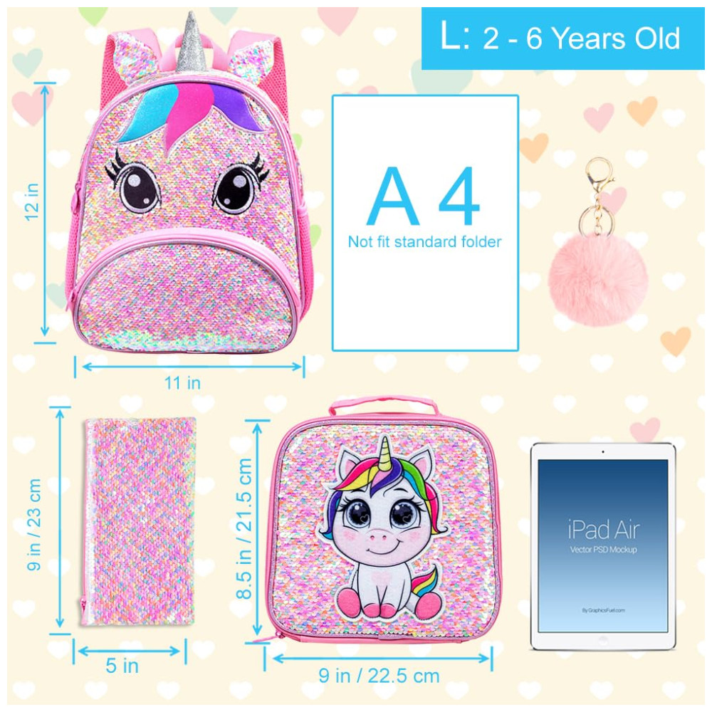 PERSPECTIVA DA MODA A mochila infantil com conjunto de lancheira é construída com material de lantejoulas reversível com efeitos brilhantes, que atrairá seu bebê para brincar sozinho