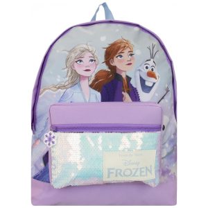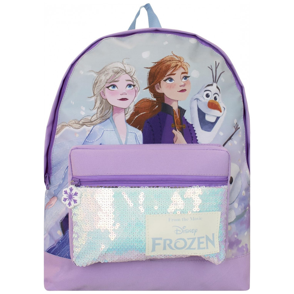 Disney Frozen oficialmente licenciada. Uma mochila lilás exibindo Elsa, Anna e Olaf, com um bolso frontal de lantejoulas e zíper de floco de neve de borracha
