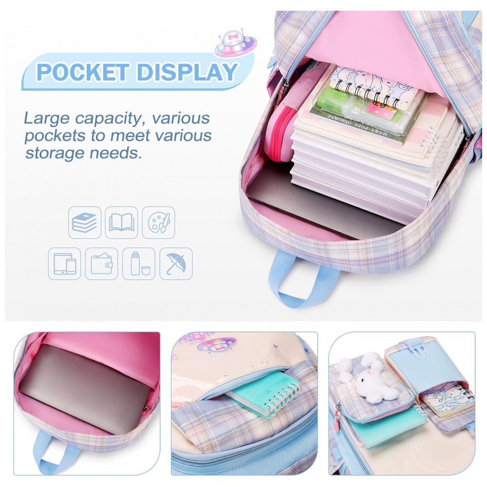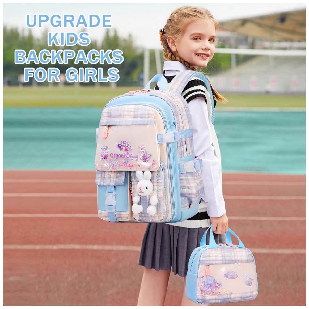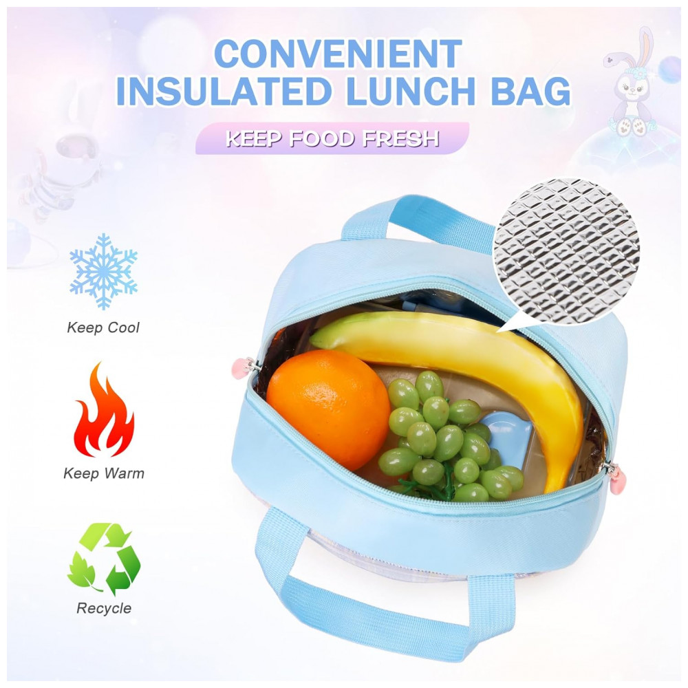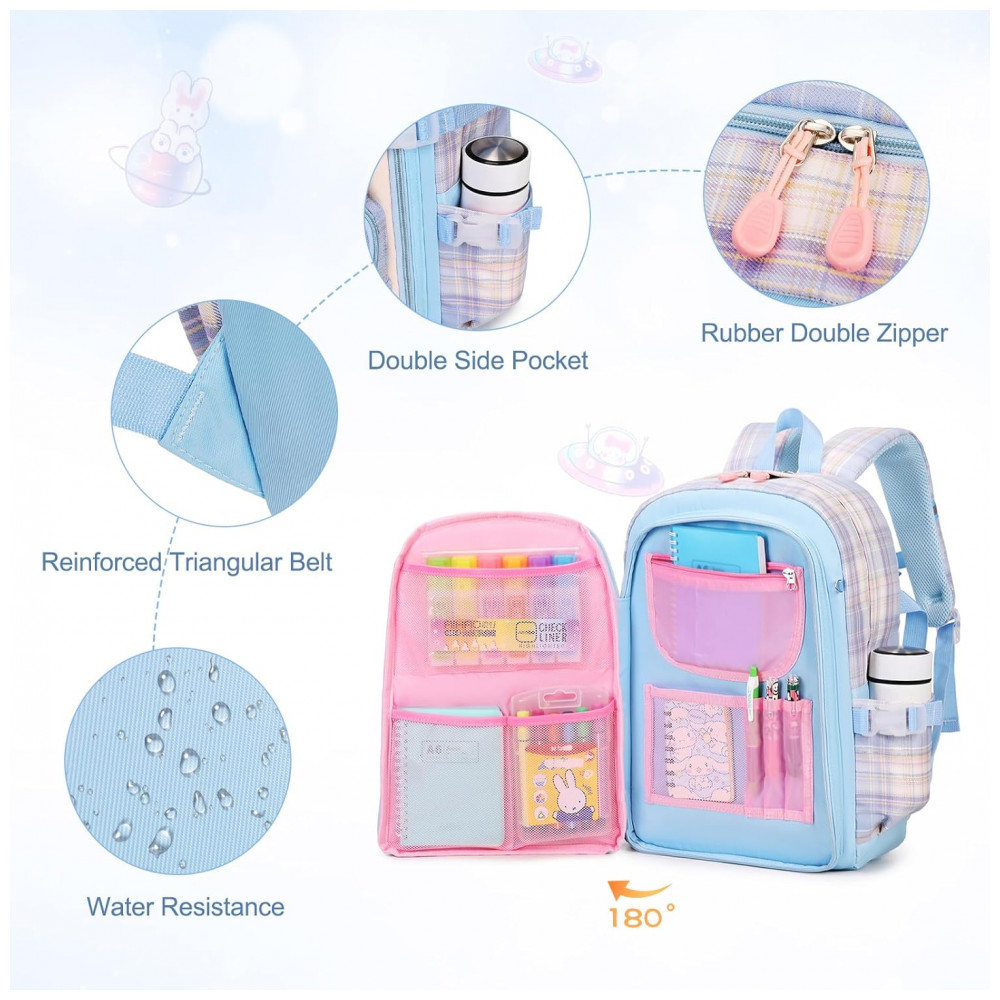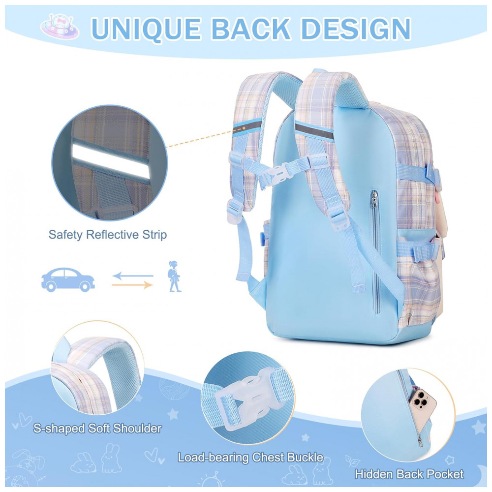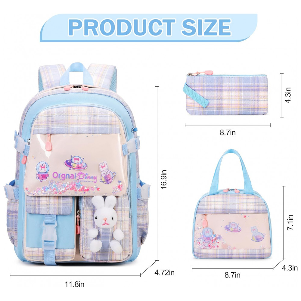 Mochila escolar infantil FIXITOK coelho kawaii 3 peças com lancheira térmica e estojo nylon impermeável azul e rosa xadrez