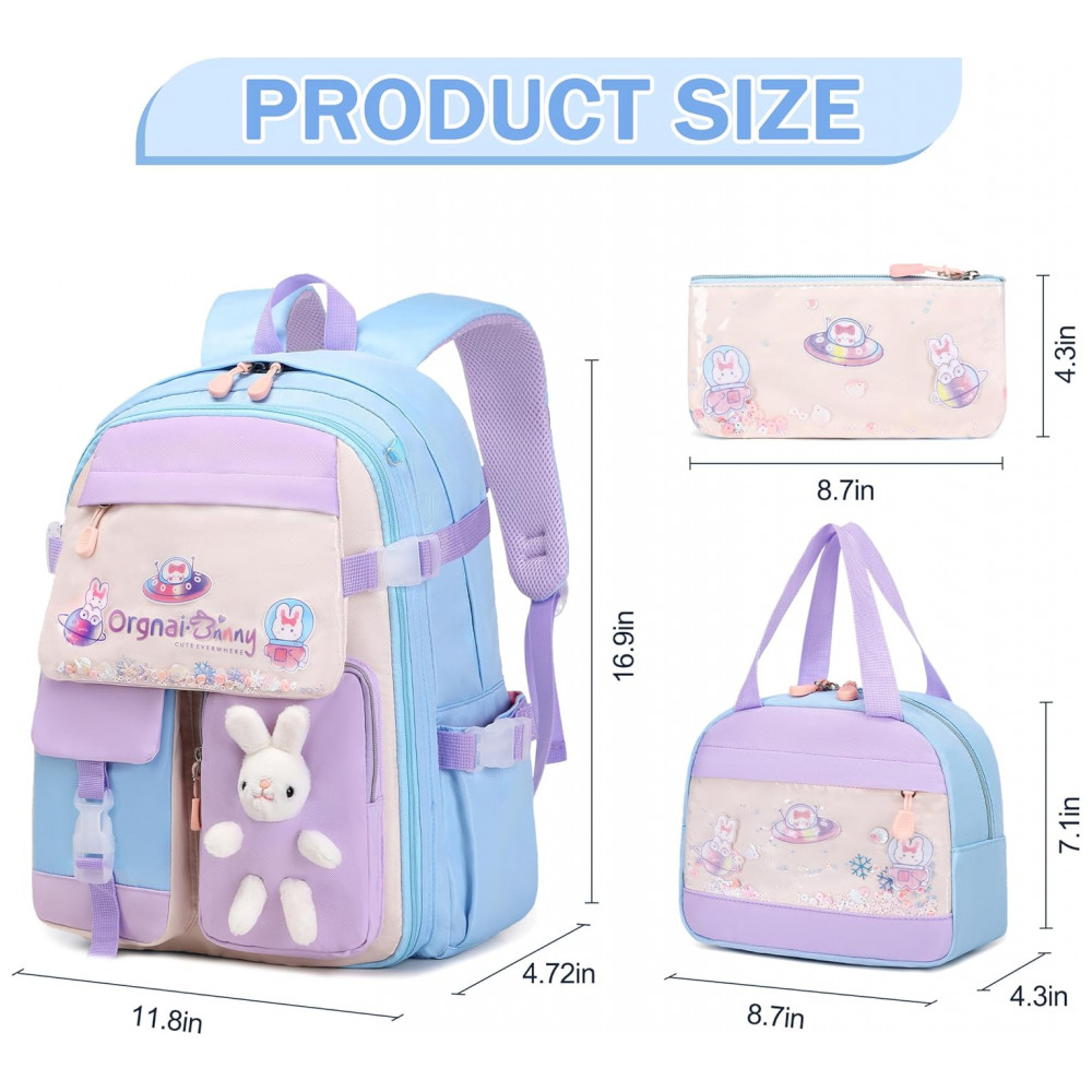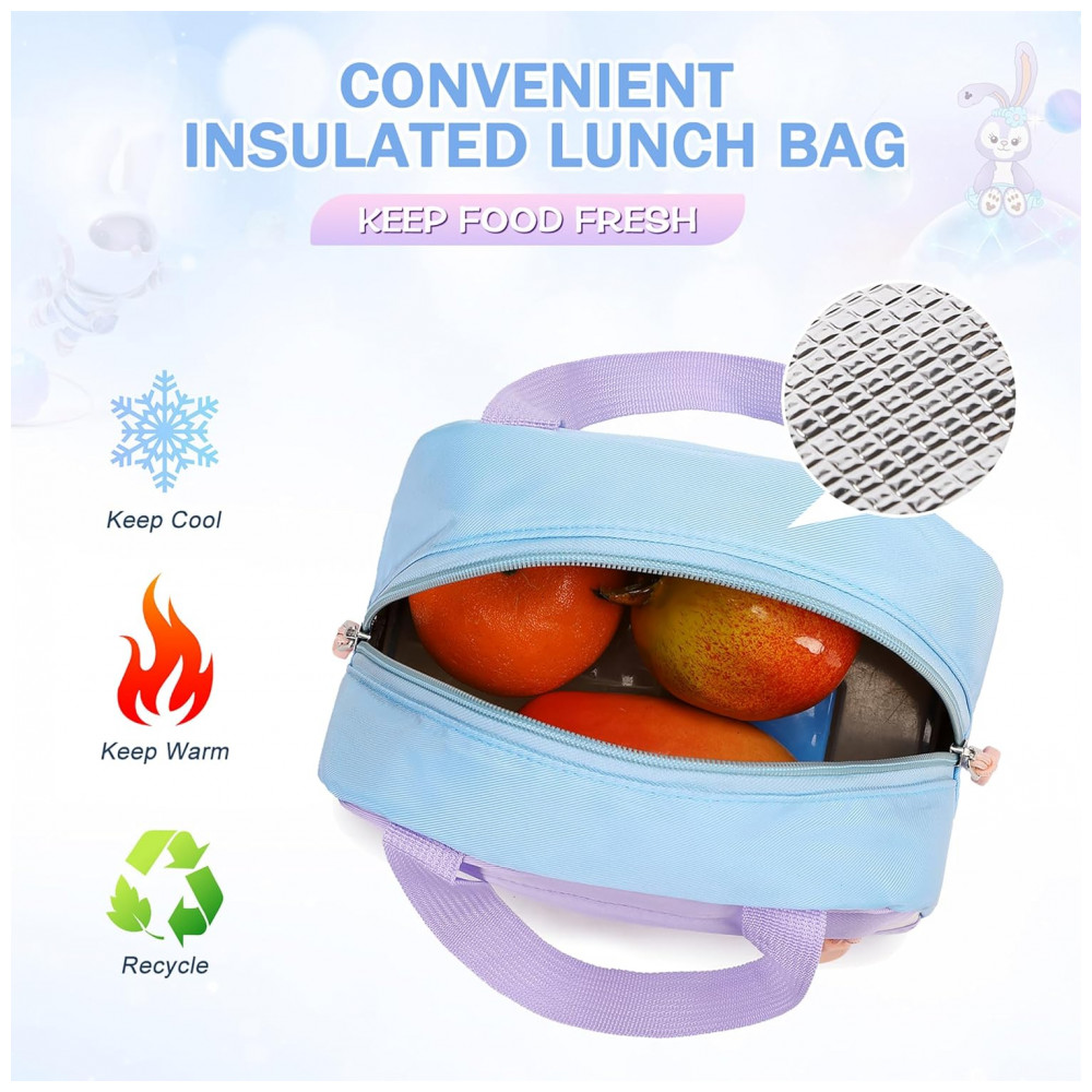 Mochila escolar infantil FIXITOK coelho kawaii 3 peças com lancheira térmica e estojo nylon impermeável azul e roxa